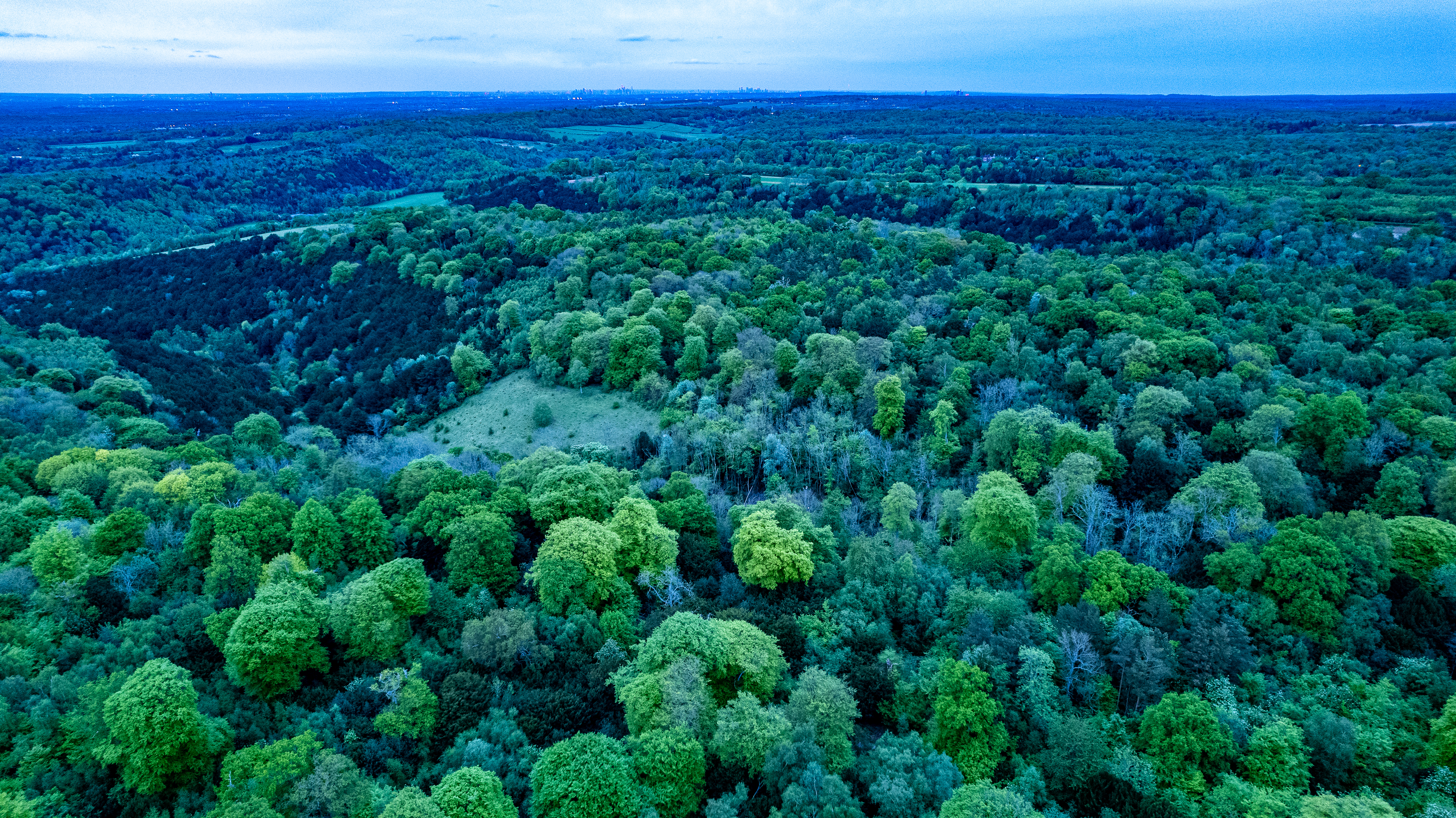 Aerial view of a lush green forest with a clearing, showcasing the dense tree canopy and natural landscape.