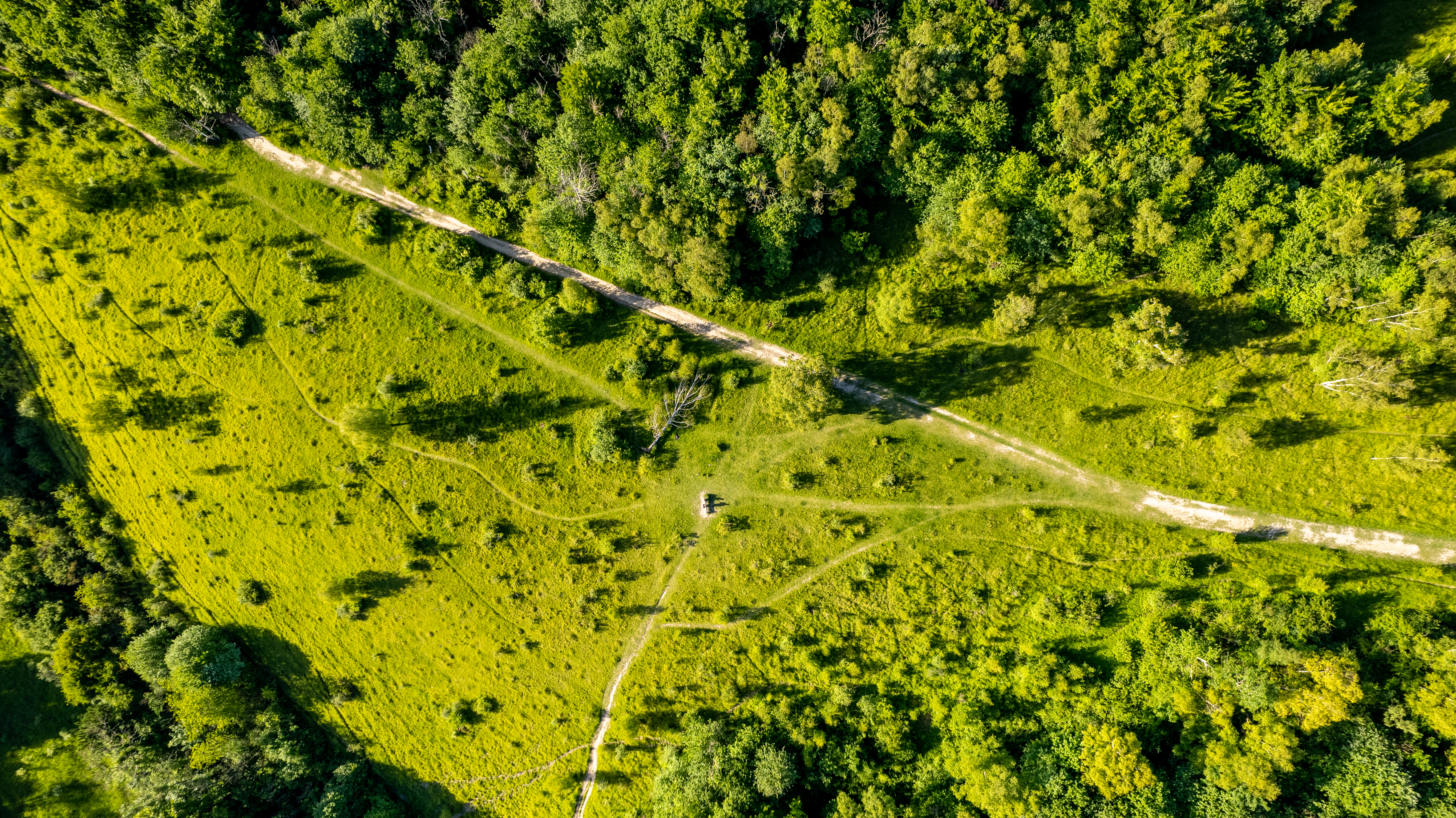 Aerial view of a lush green forest with a winding dirt path.