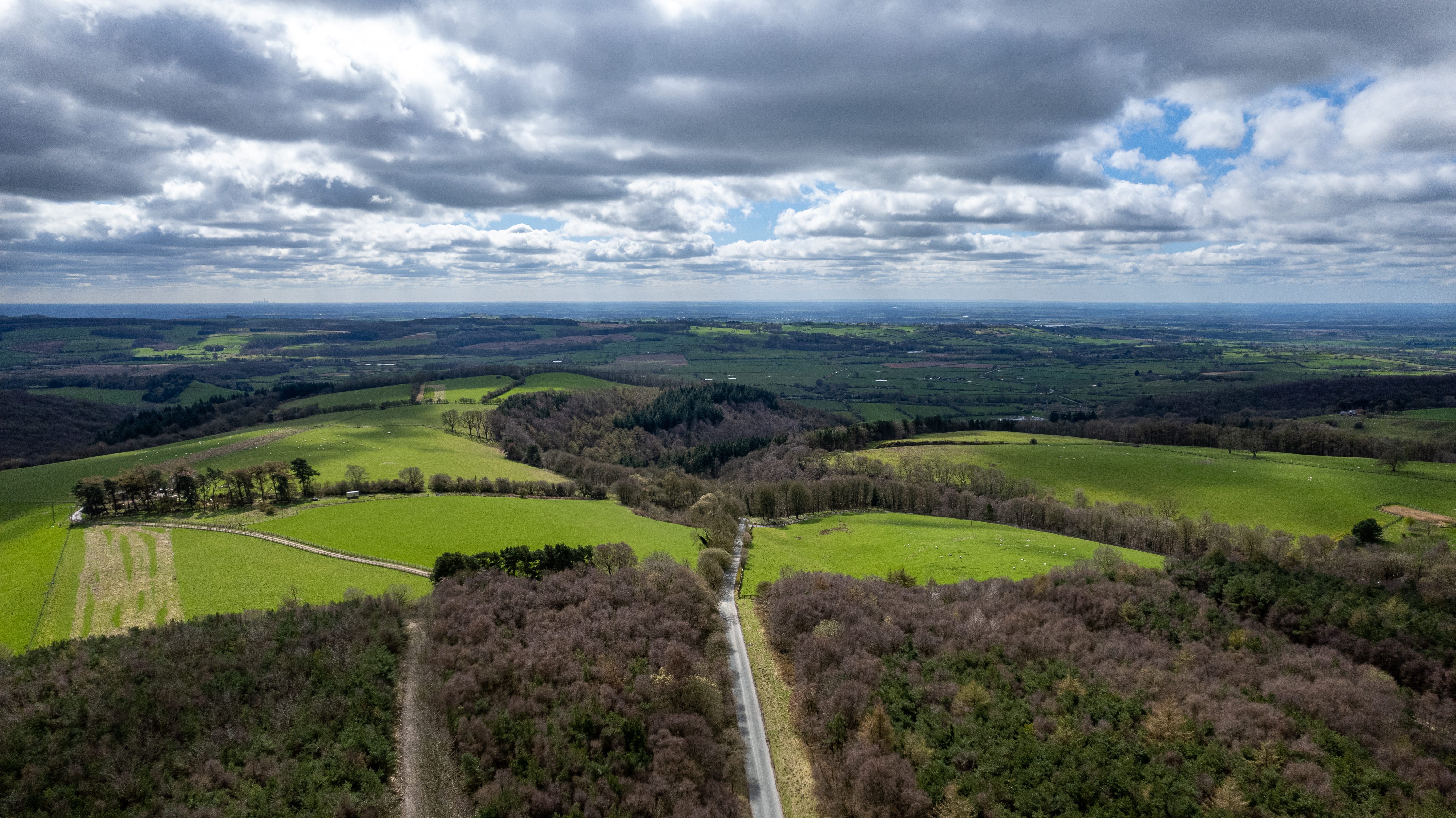 Aerial view of a lush green landscape with a road cutting through, under a cloudy sky.