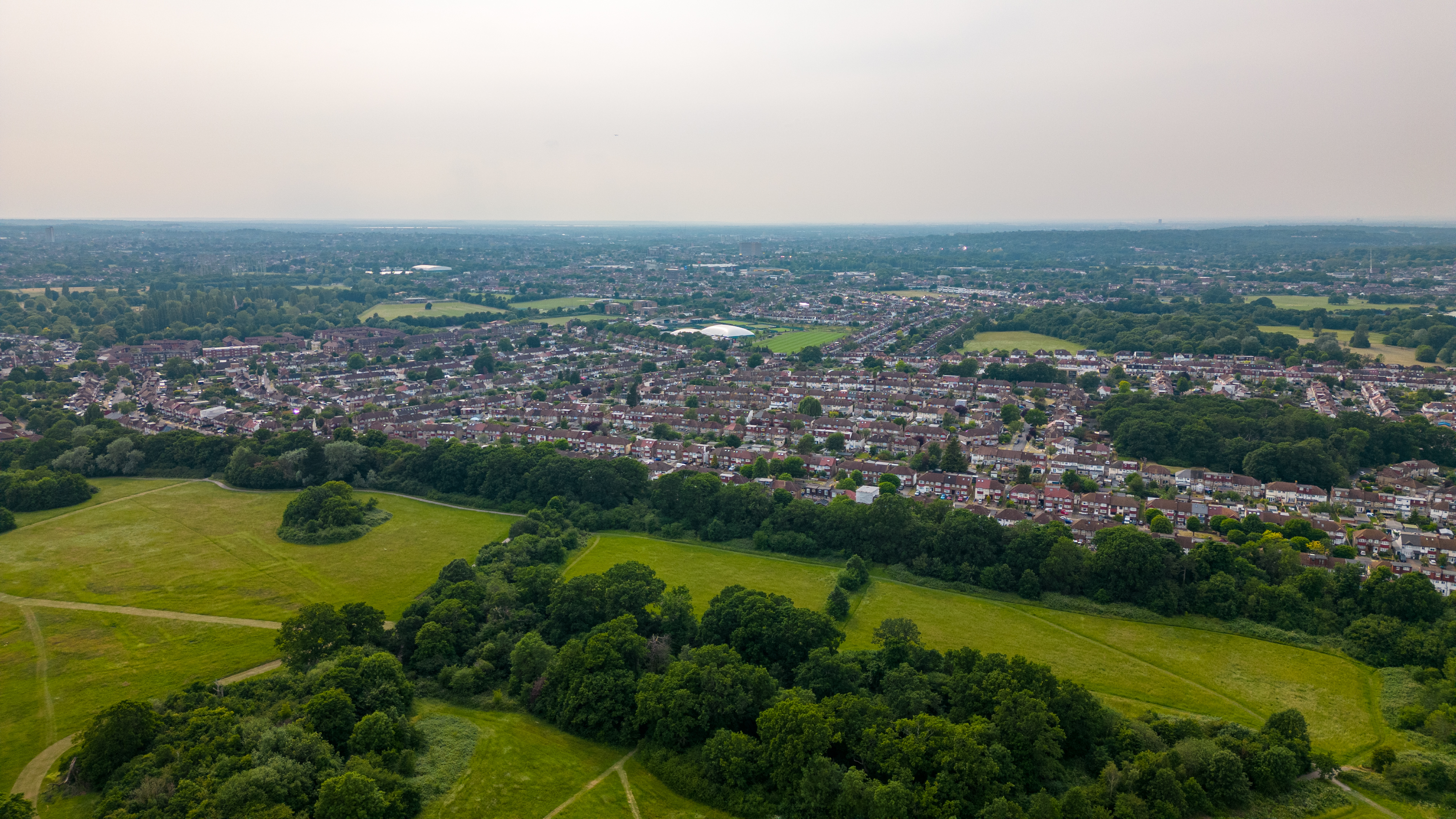 Aerial view of a lush green landscape with urban cityscape in the distance under a hazy sky in London.
