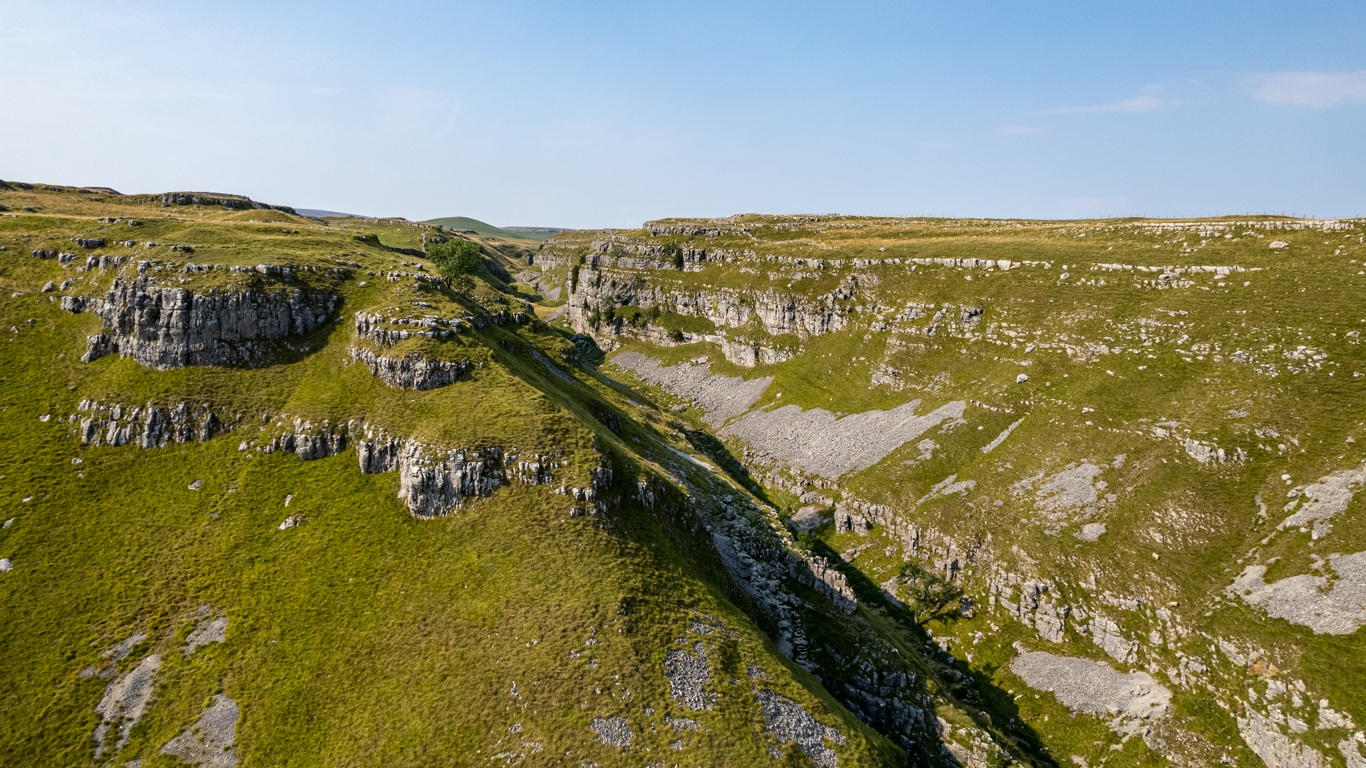 Aerial view of a lush green limestone valley with rocky cliffs under a clear blue sky.
