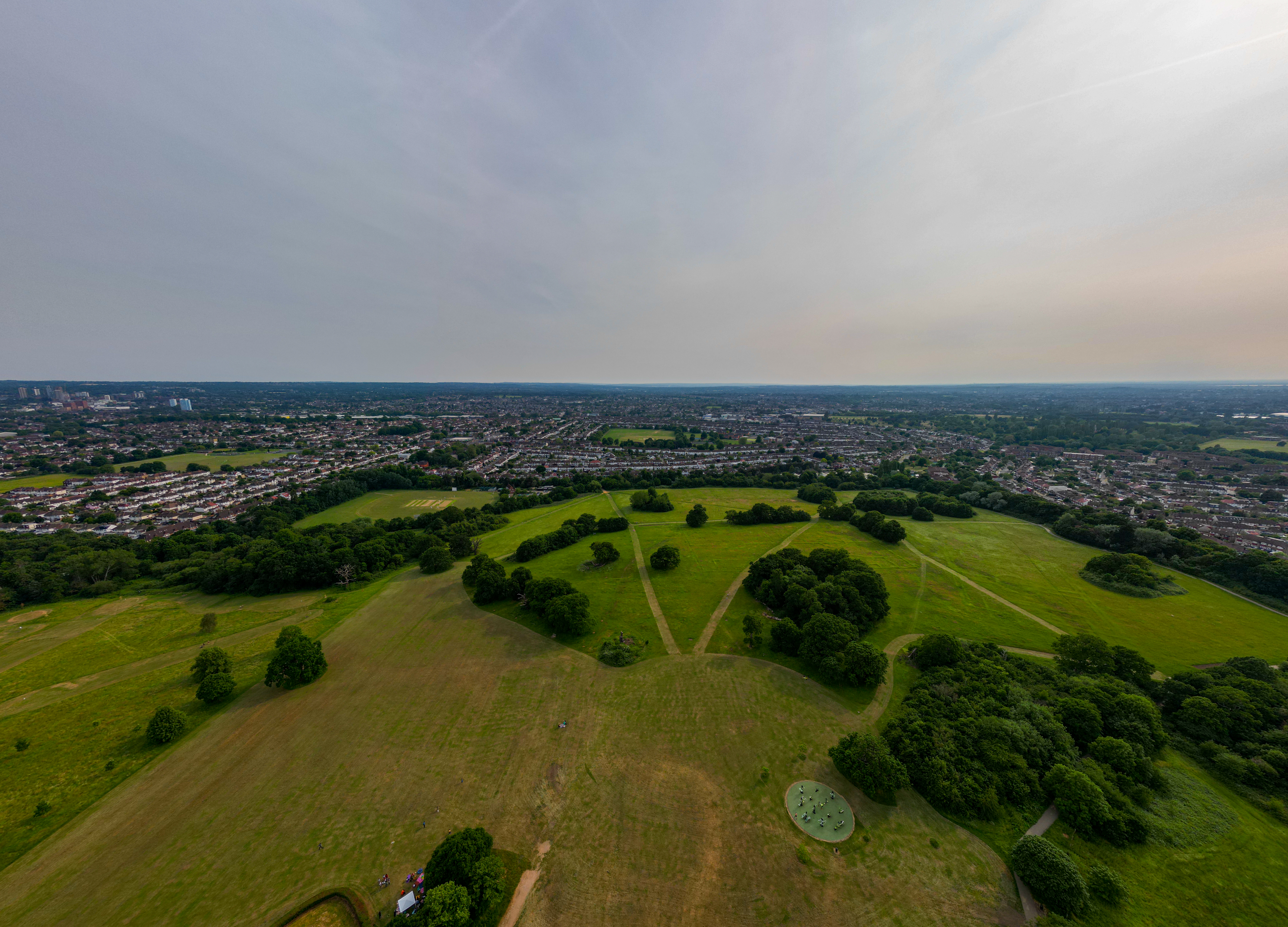 Aerial view of a lush green park with walking paths, surrounded by a suburban landscape under a hazy sky in London.