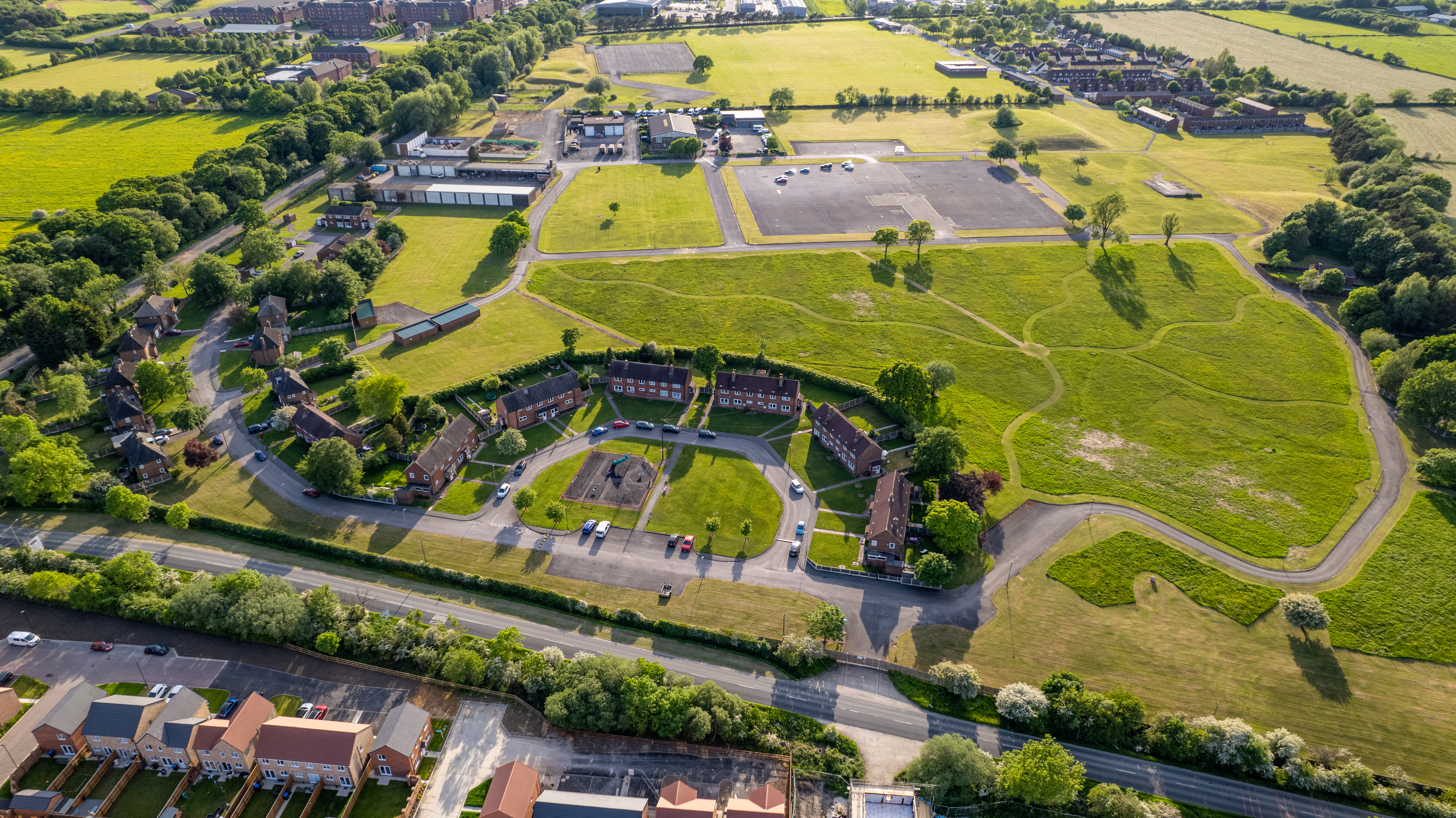 Aerial view of a lush green suburban area with residential houses, roads, and open spaces.