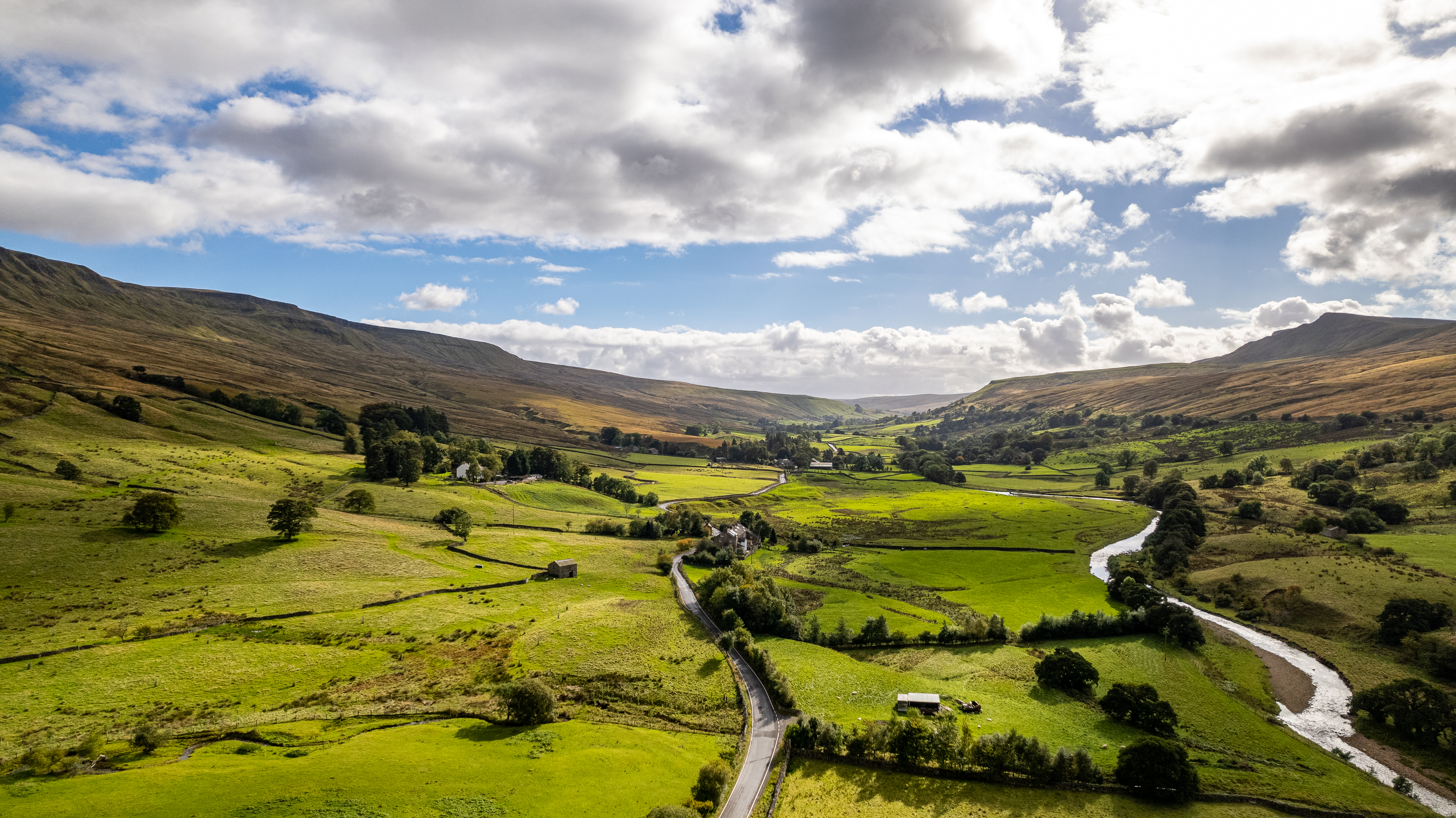 Aerial view of a lush green valley with a winding river, patchwork fields, and rolling hills under a partly cloudy sky.