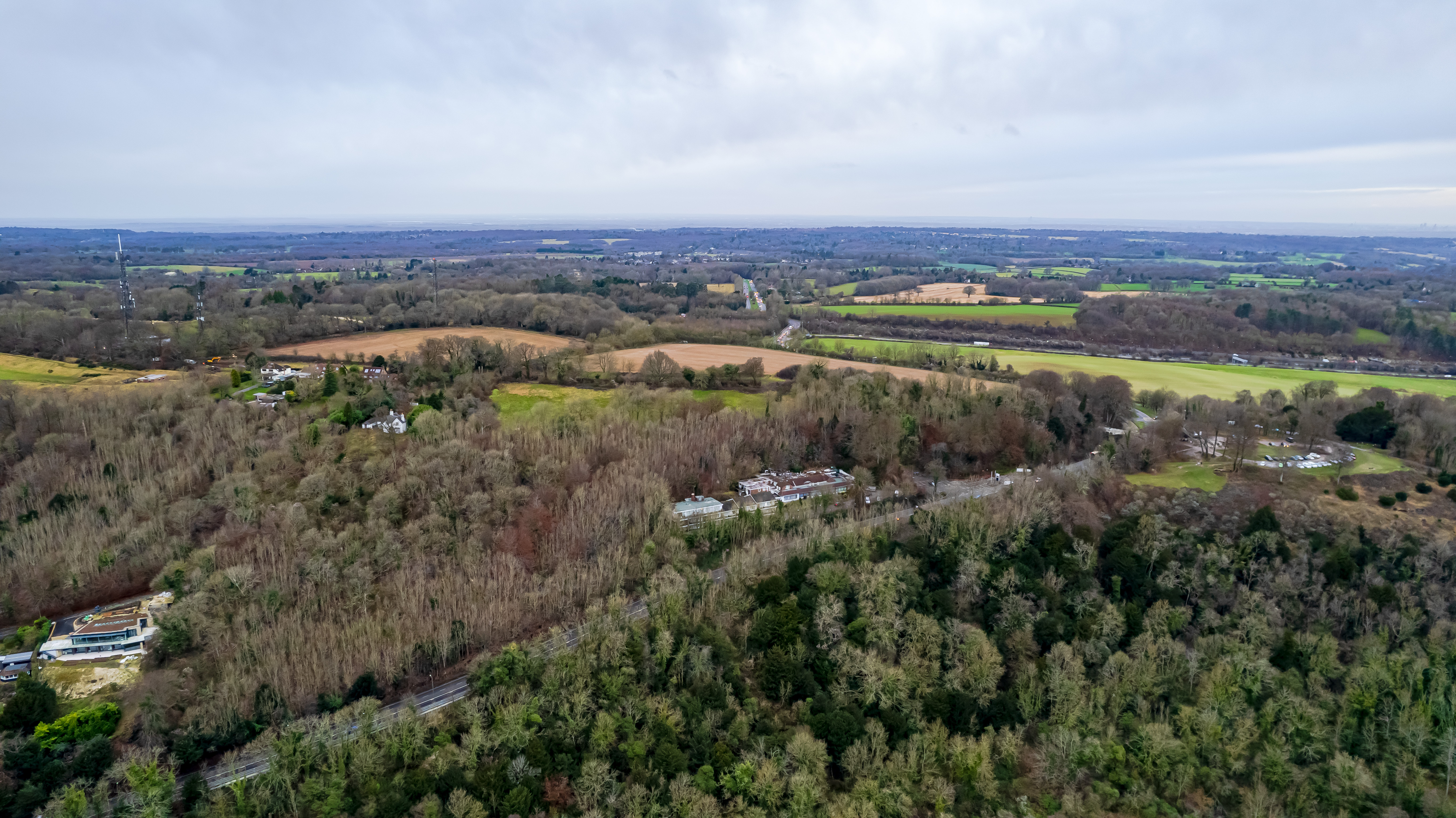 Aerial view of a lush landscape with mixed woodland and open fields under a cloudy sky.