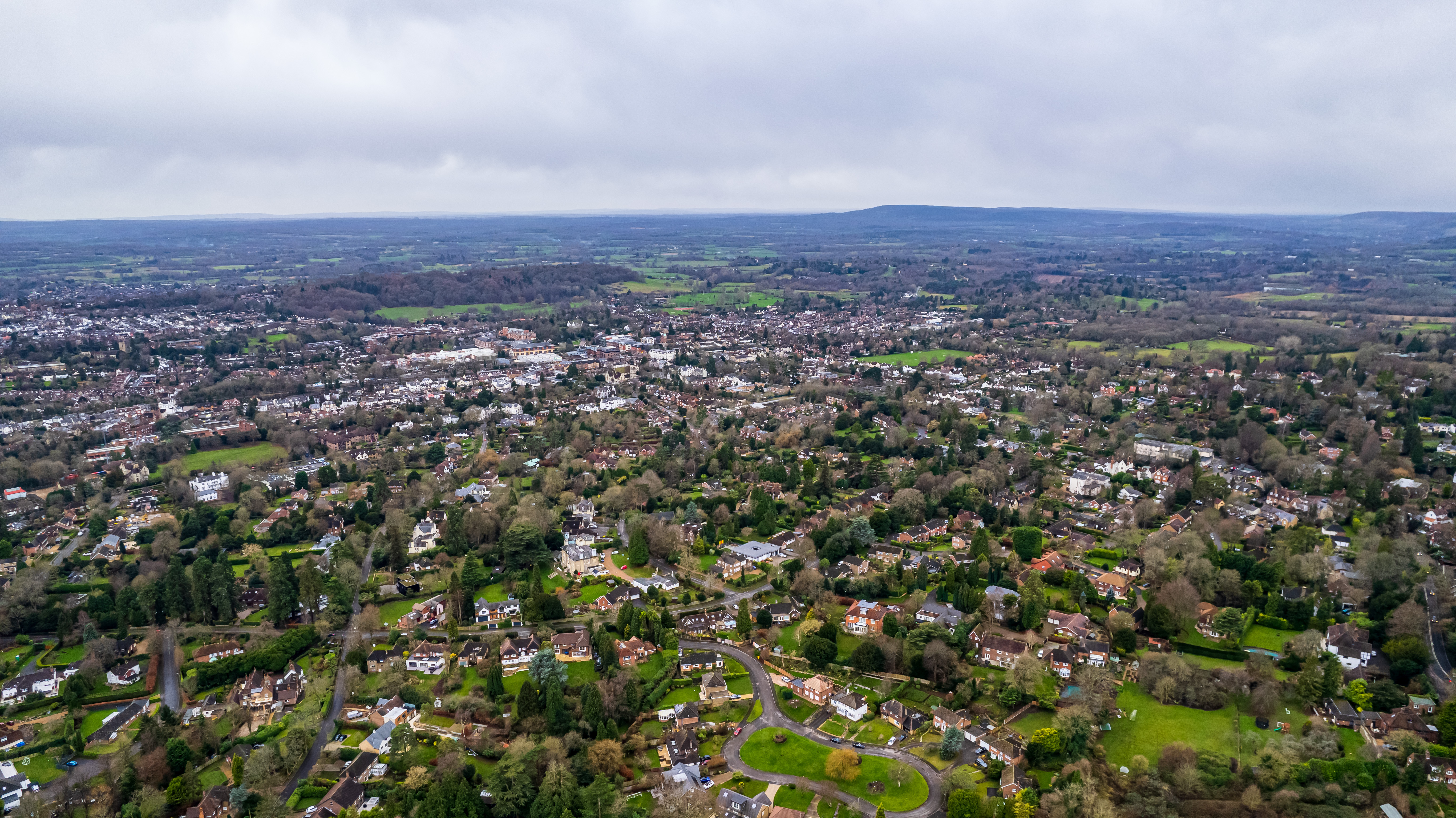 Aerial view of a lush suburban area with dense housing and greenery under a cloudy sky.
