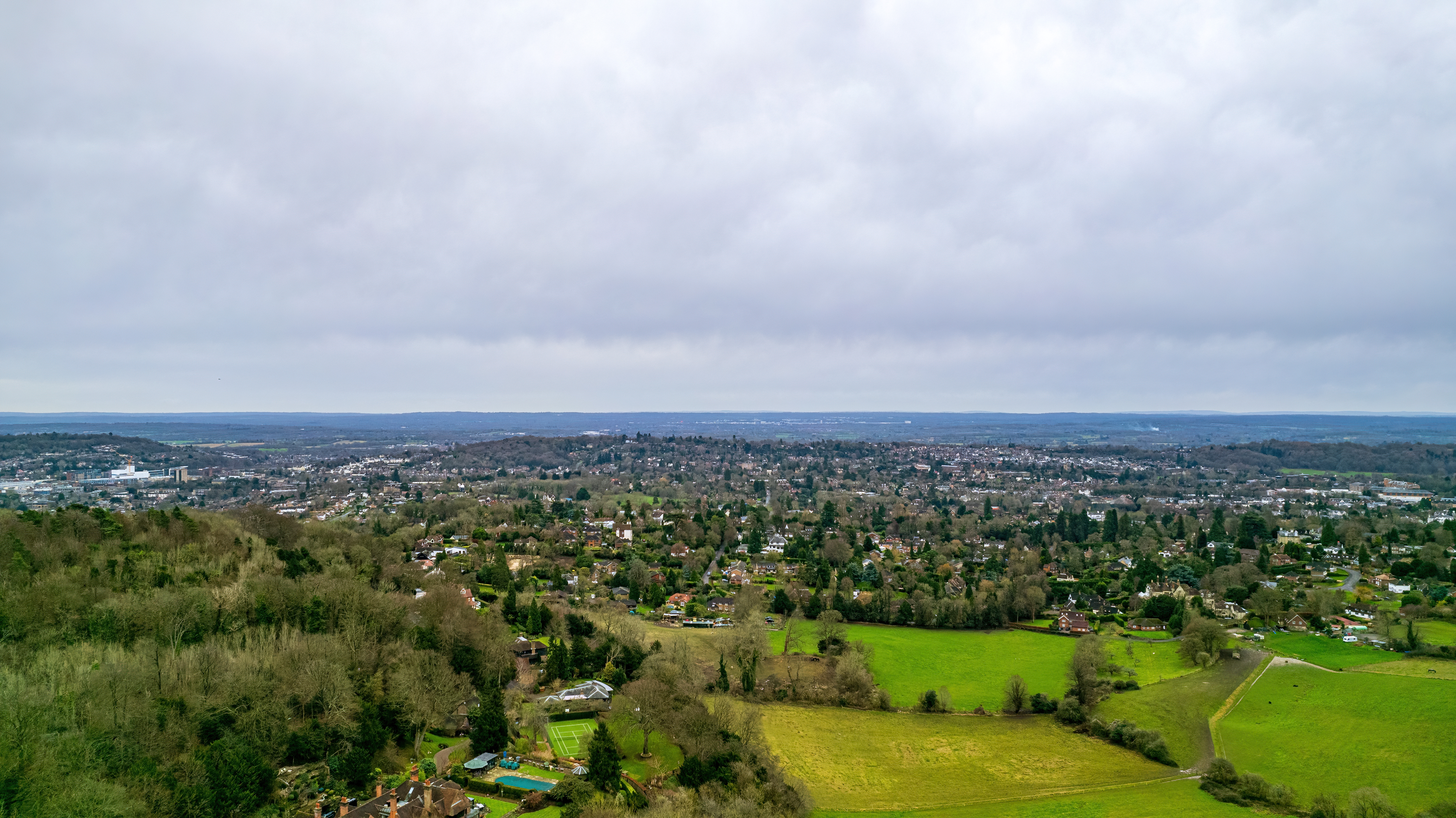Aerial view of a lush suburban area with green fields under a cloudy sky.