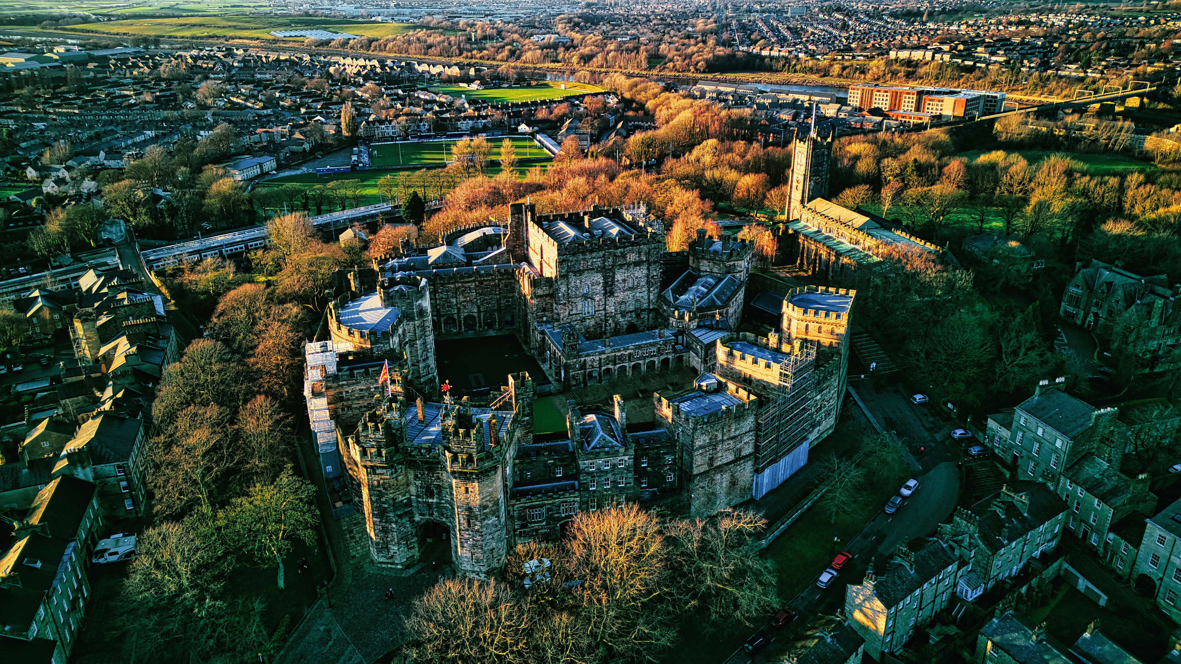 Aerial view of a majestic Lancaster castle surrounded by greenery with a town in the background during sunset.
