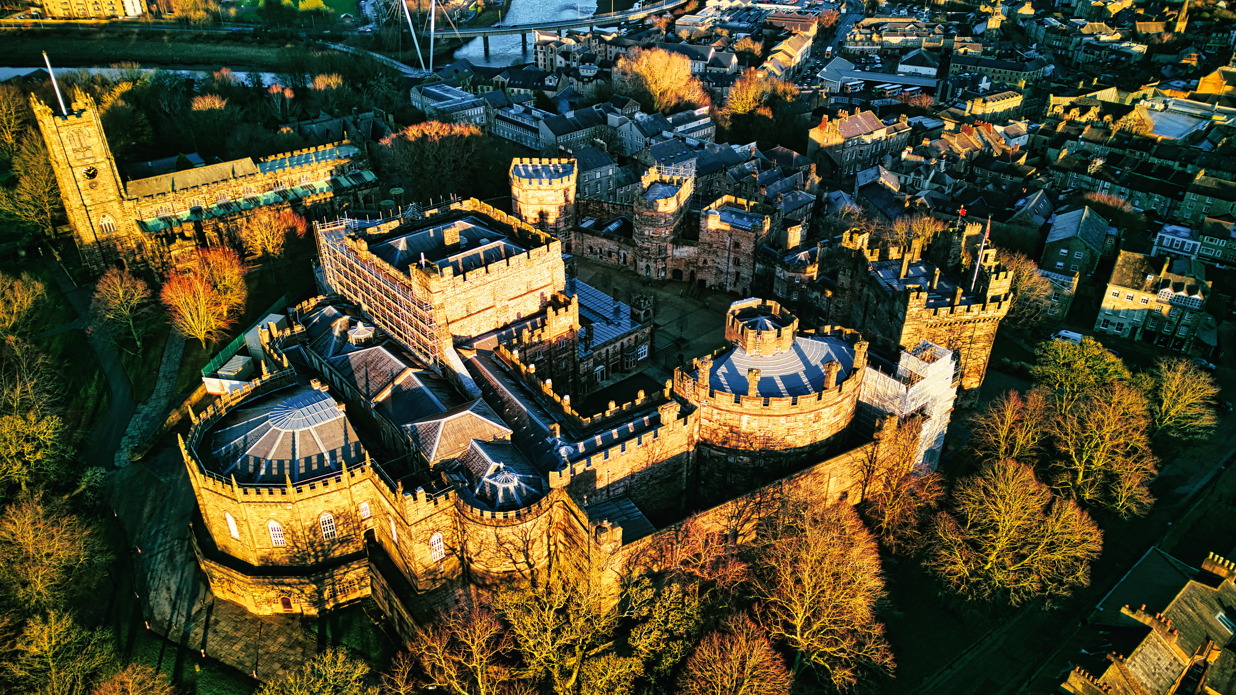 Aerial view of a majestic medieval Lancaster castle at sunset, with surrounding greenery and town in the background.