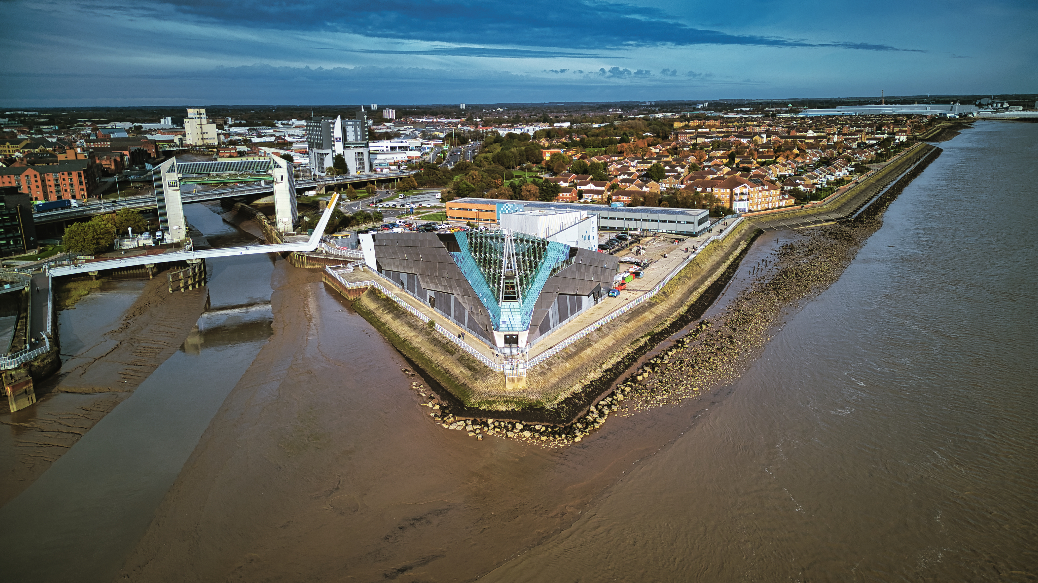 Aerial view of a modern flood barrier on a muddy river near an urban area under a cloudy sky in Hull, England.