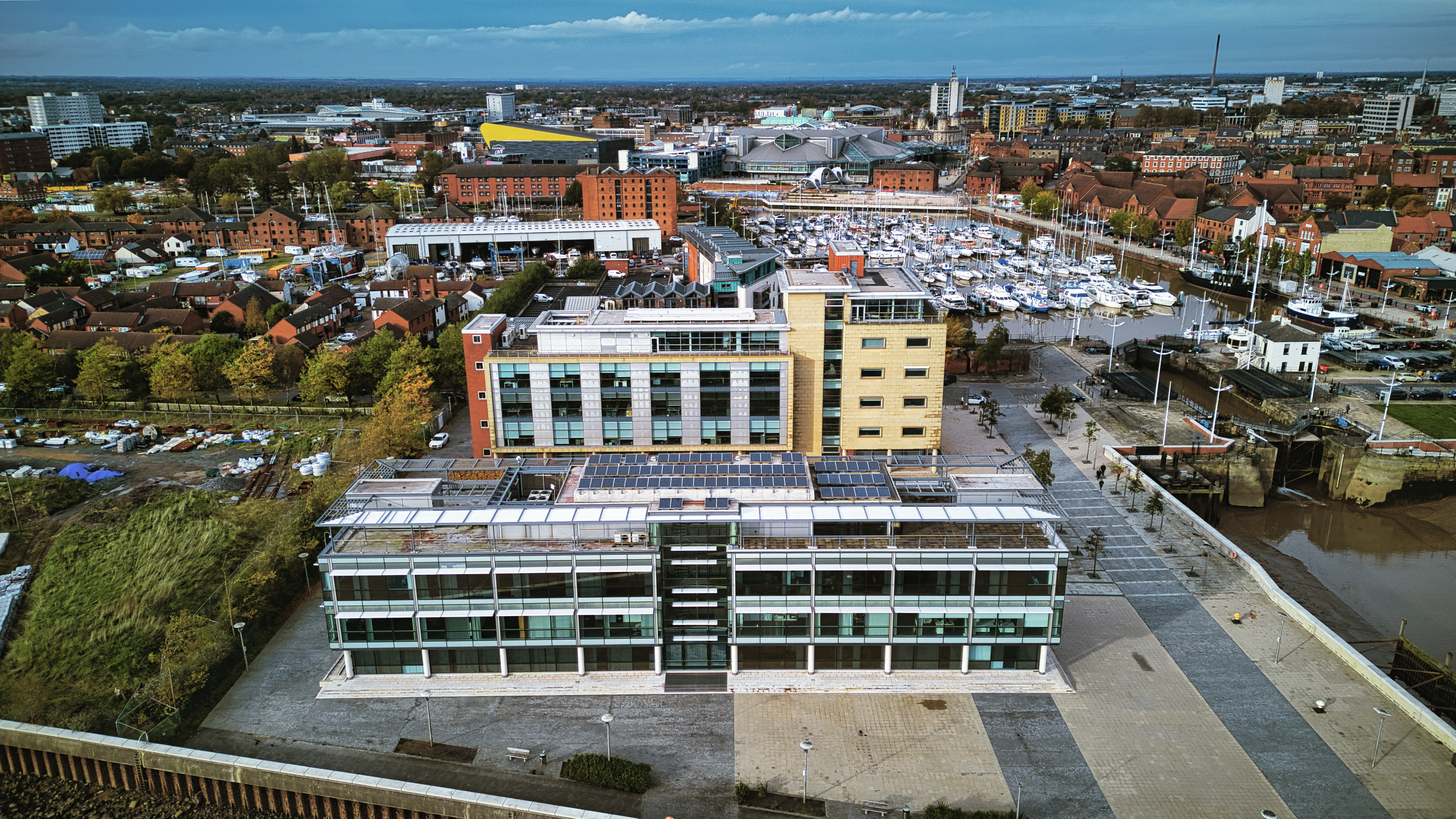 Aerial view of a modern office building in an urban landscape with parking and surrounding infrastructure in Hull, England.
