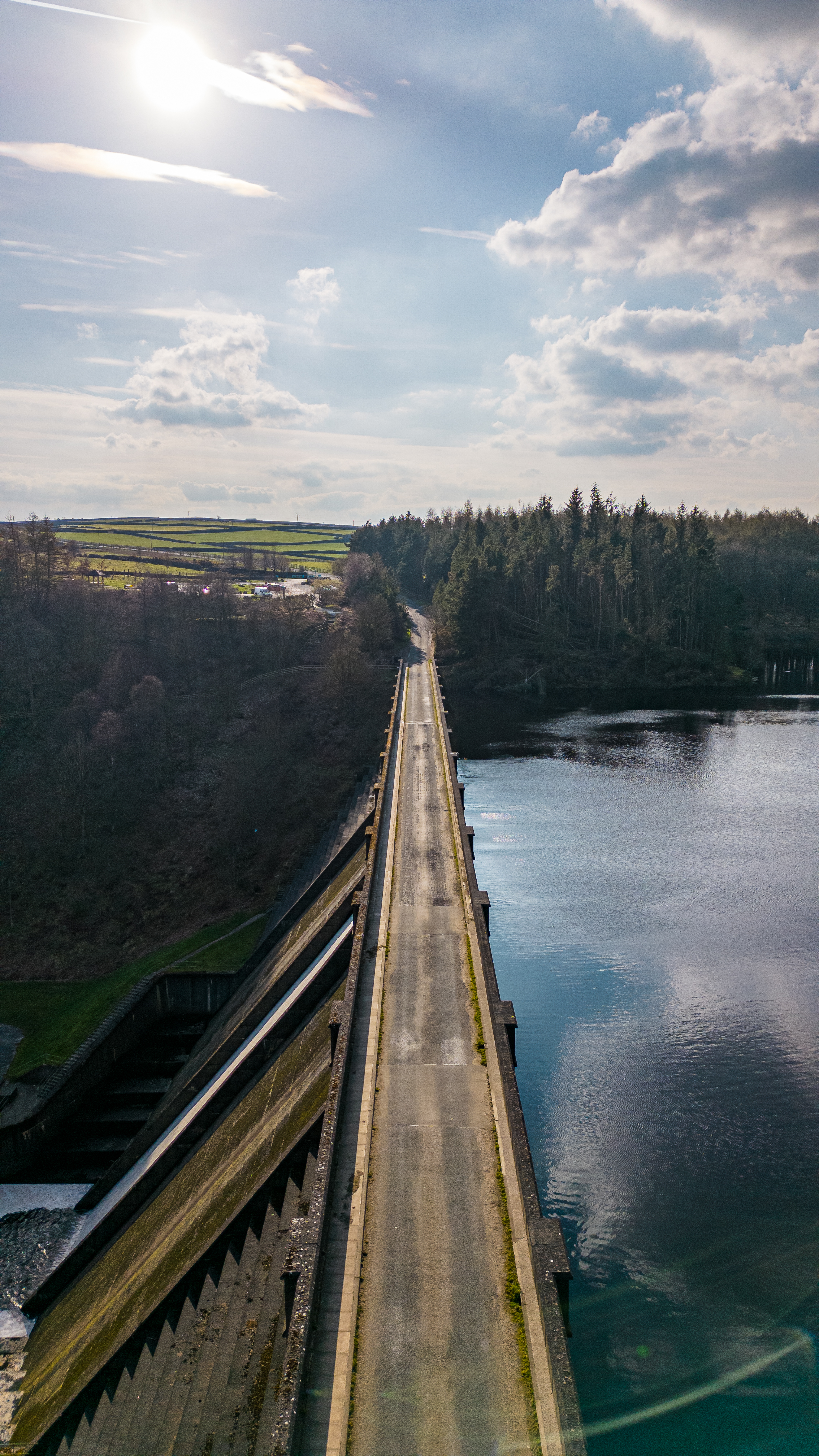 Aerial view of a narrow bridge over a tranquil river, surrounded by lush greenery under a partly cloudy sky.