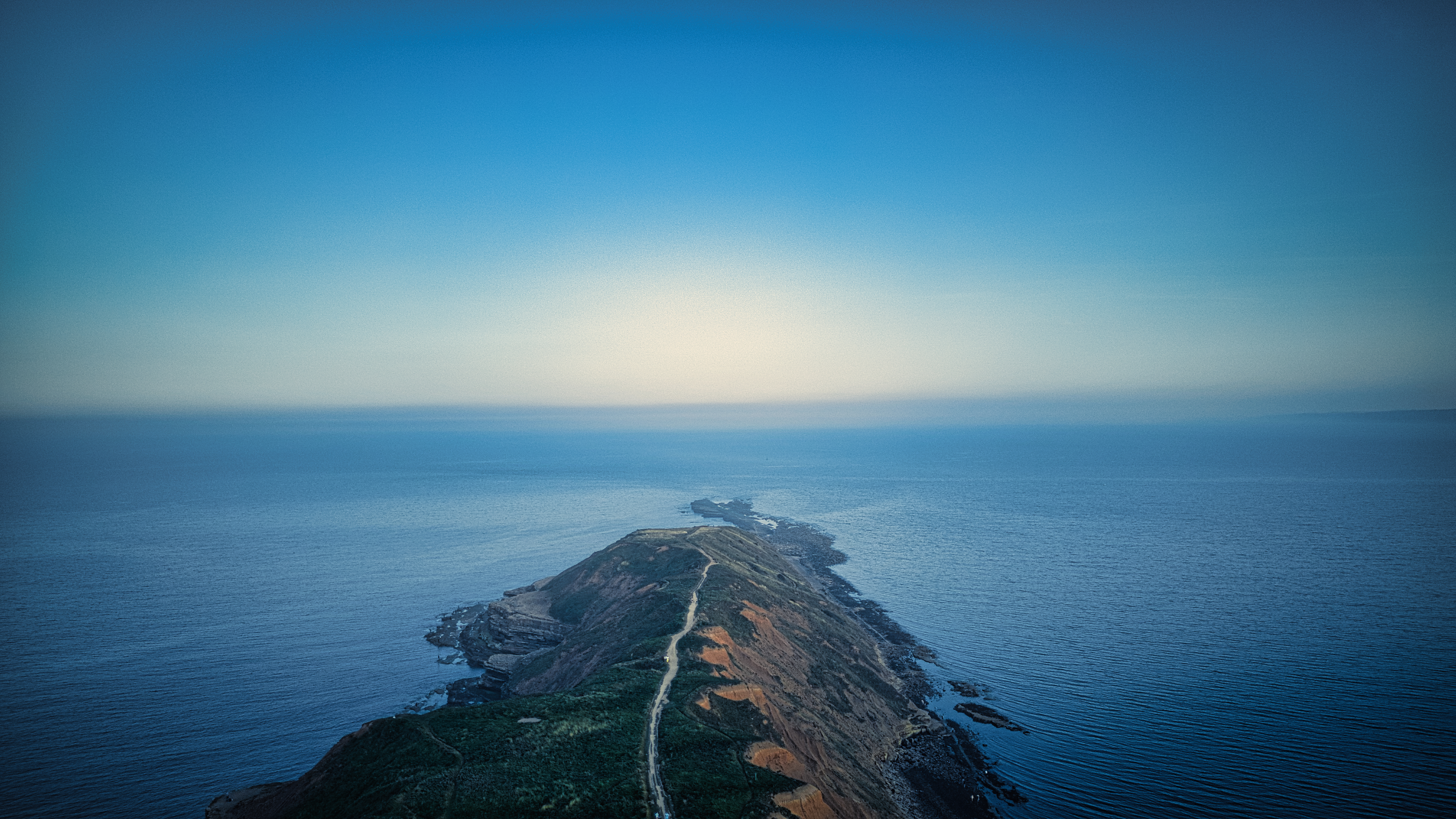 Aerial view of a narrow peninsula with a road, surrounded by the sea under a clear blue sky in Filey, England.