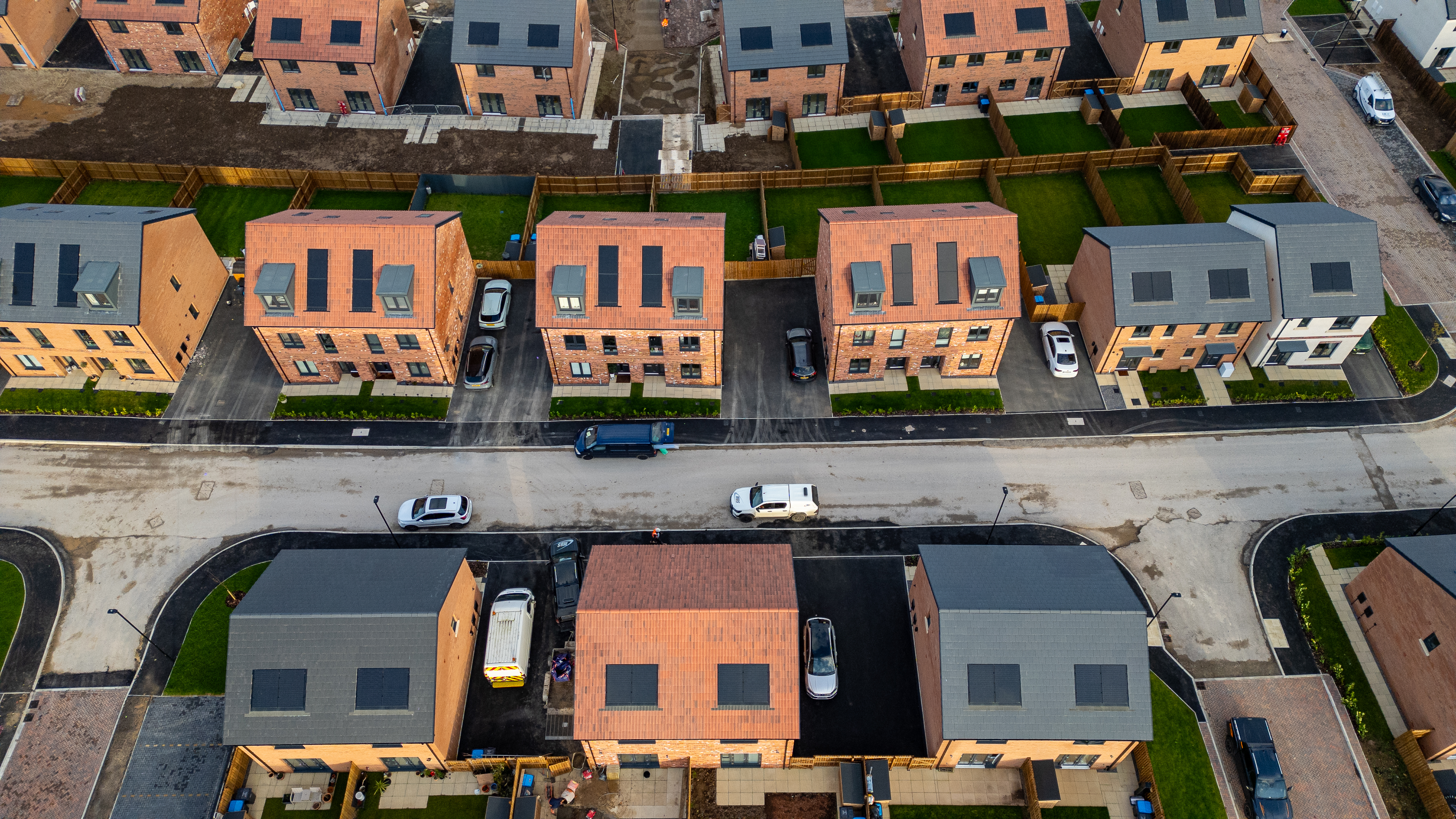 Aerial view of a newly built residential neighborhood featuring rows of brick and rendered houses with dark roofs and solar panels at Taylor Wimpey, Ripon.