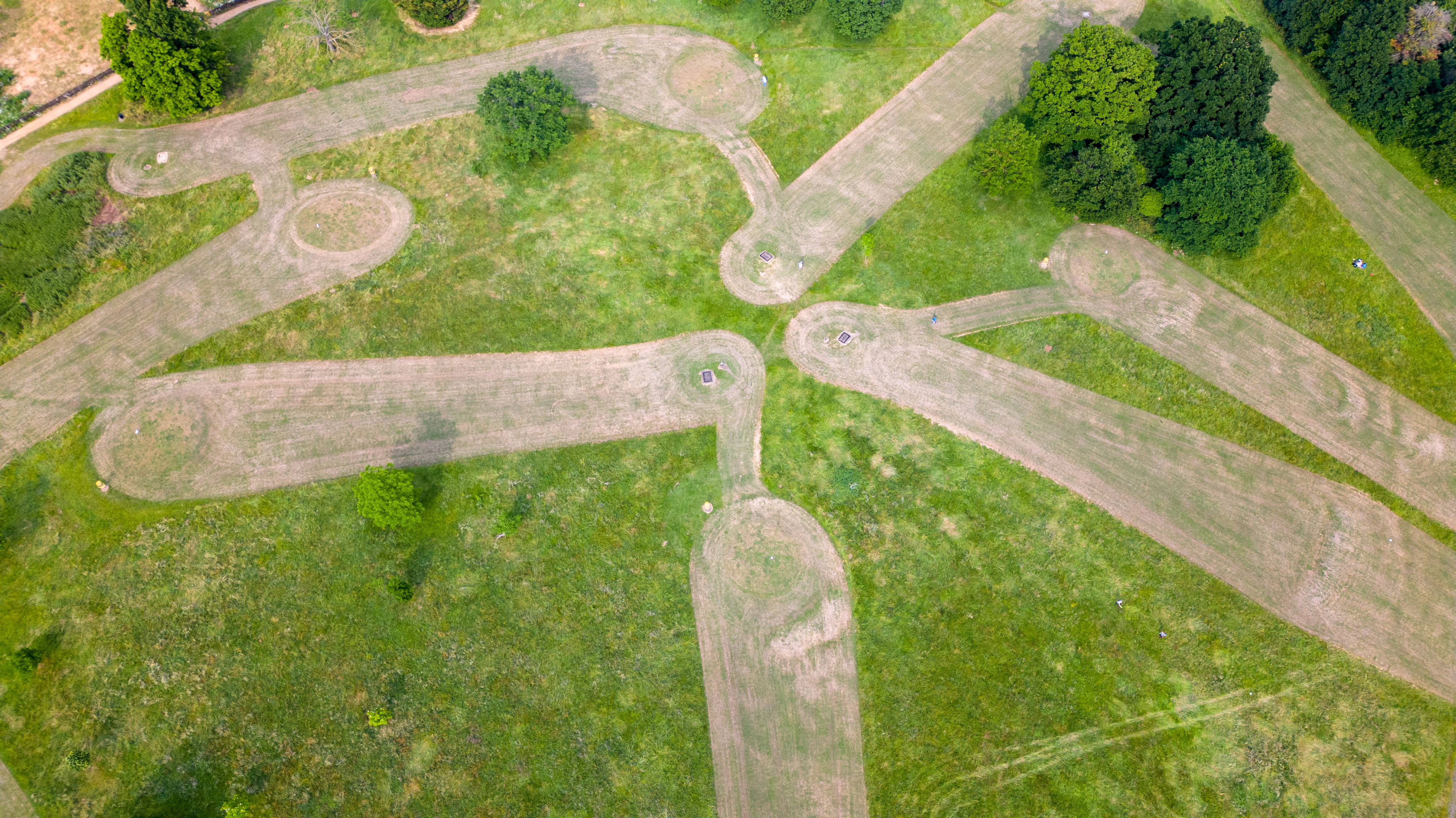 Aerial view of a park with crisscrossing dirt paths and green grass in London.