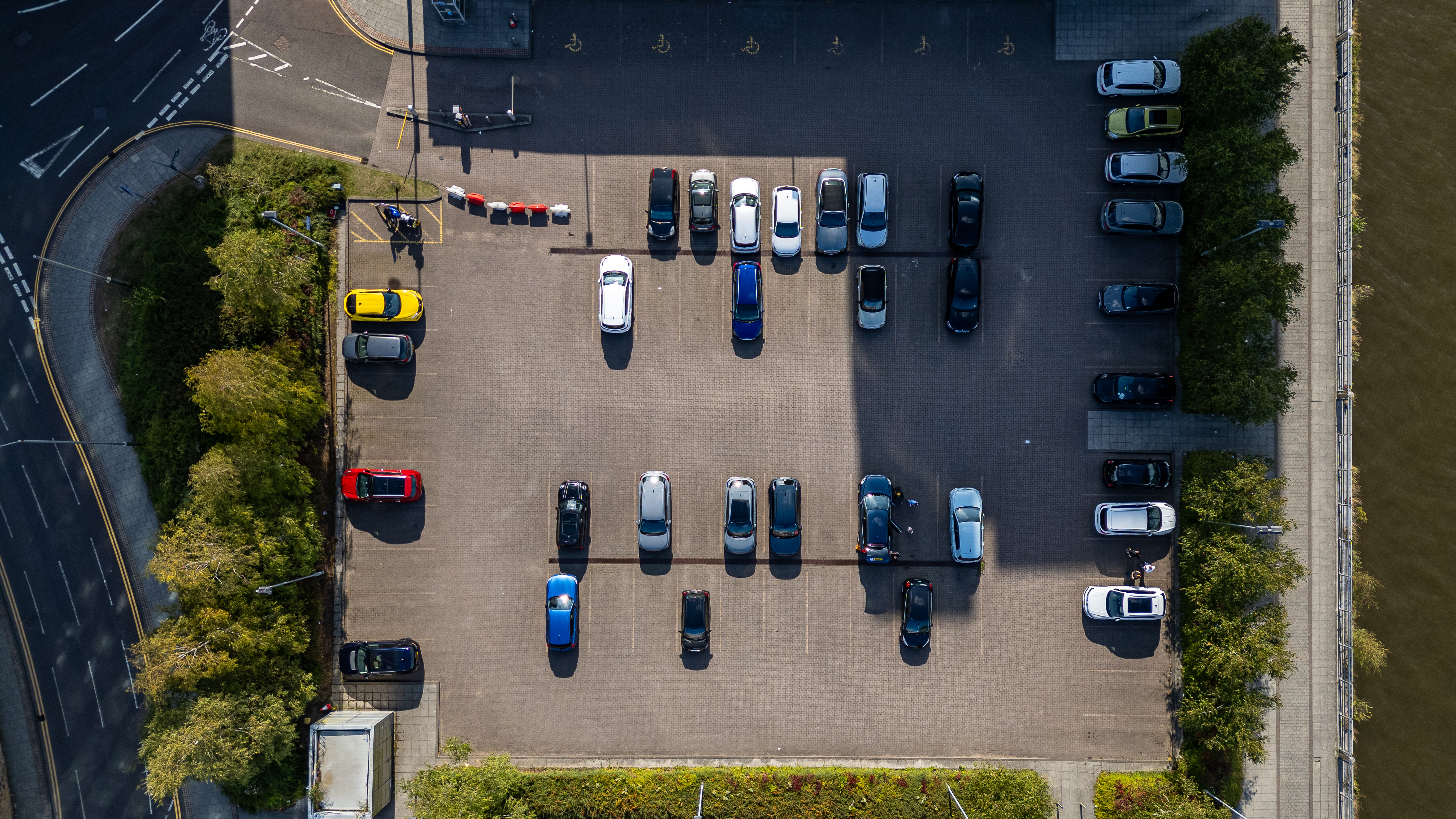 Aerial view of a parking lot with cars, trees, a road, and a walkway next to a body of water in Newcastle upon Tyne, UK.