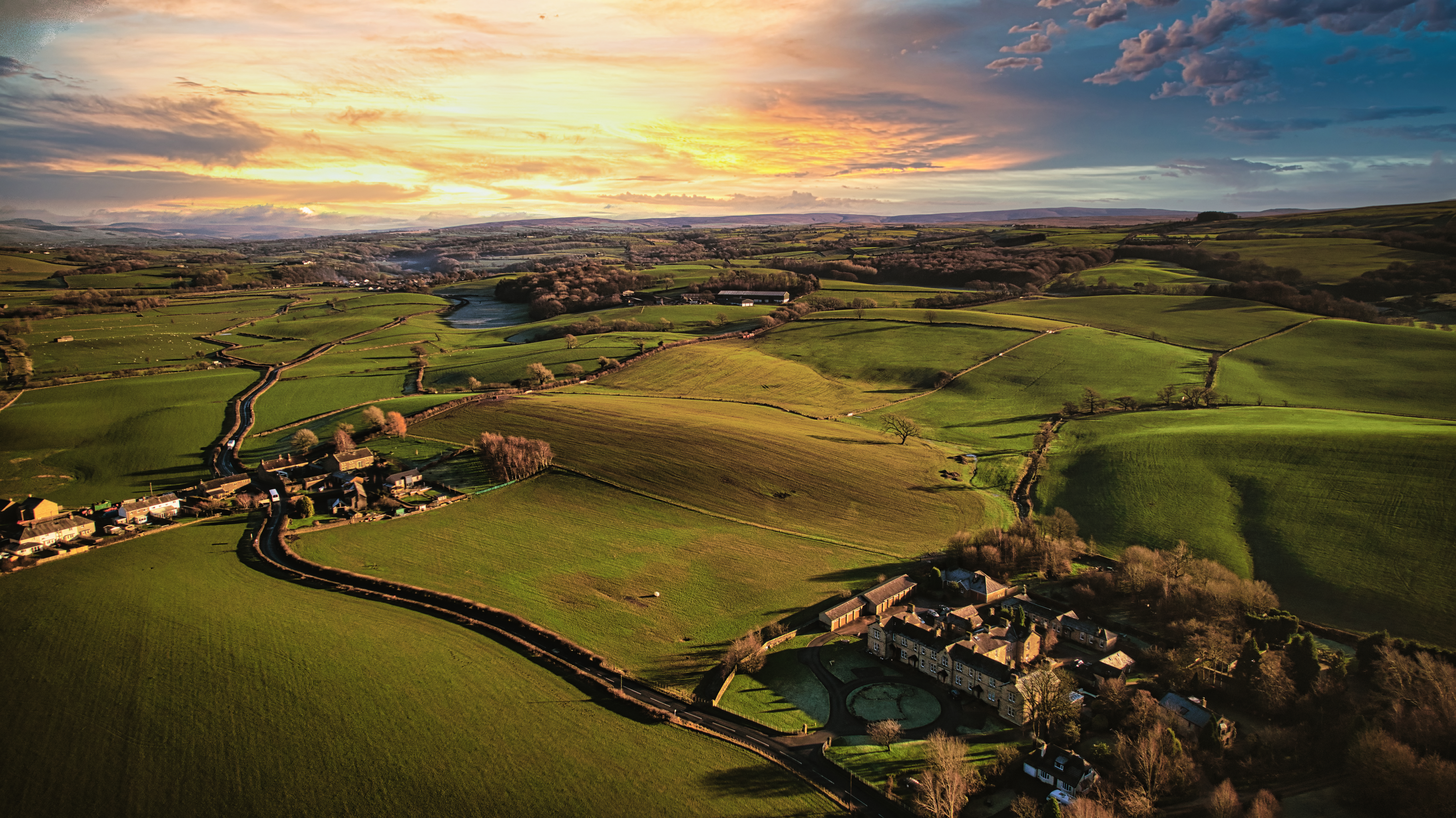 Aerial view of a picturesque rural landscape at sunset with rolling hills, a winding road, and a small village.