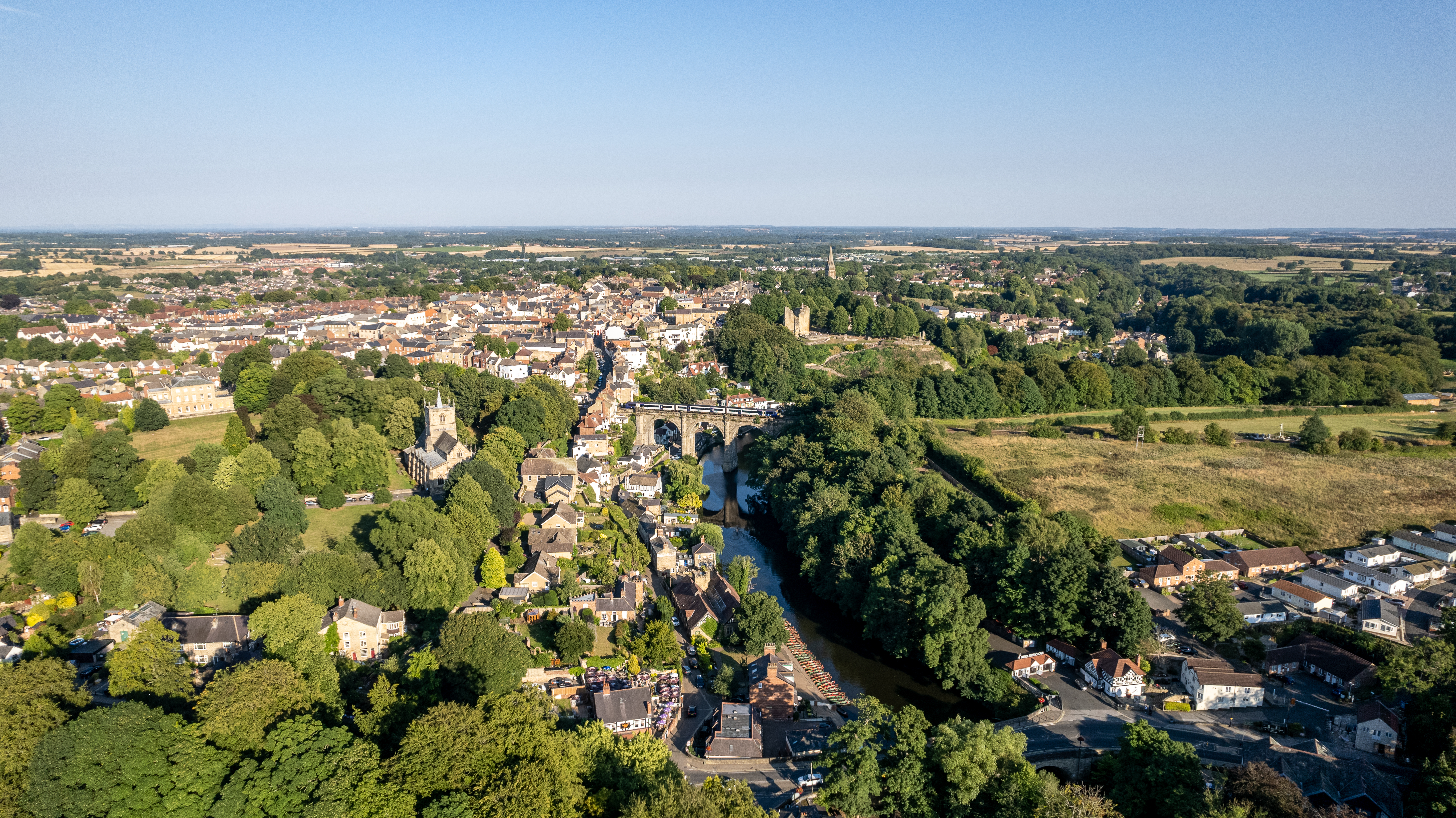 Aerial view of a quaint European village with traditional houses, surrounded by lush greenery and fields under a clear blue sky in Knaresborough, North Yorkshire.