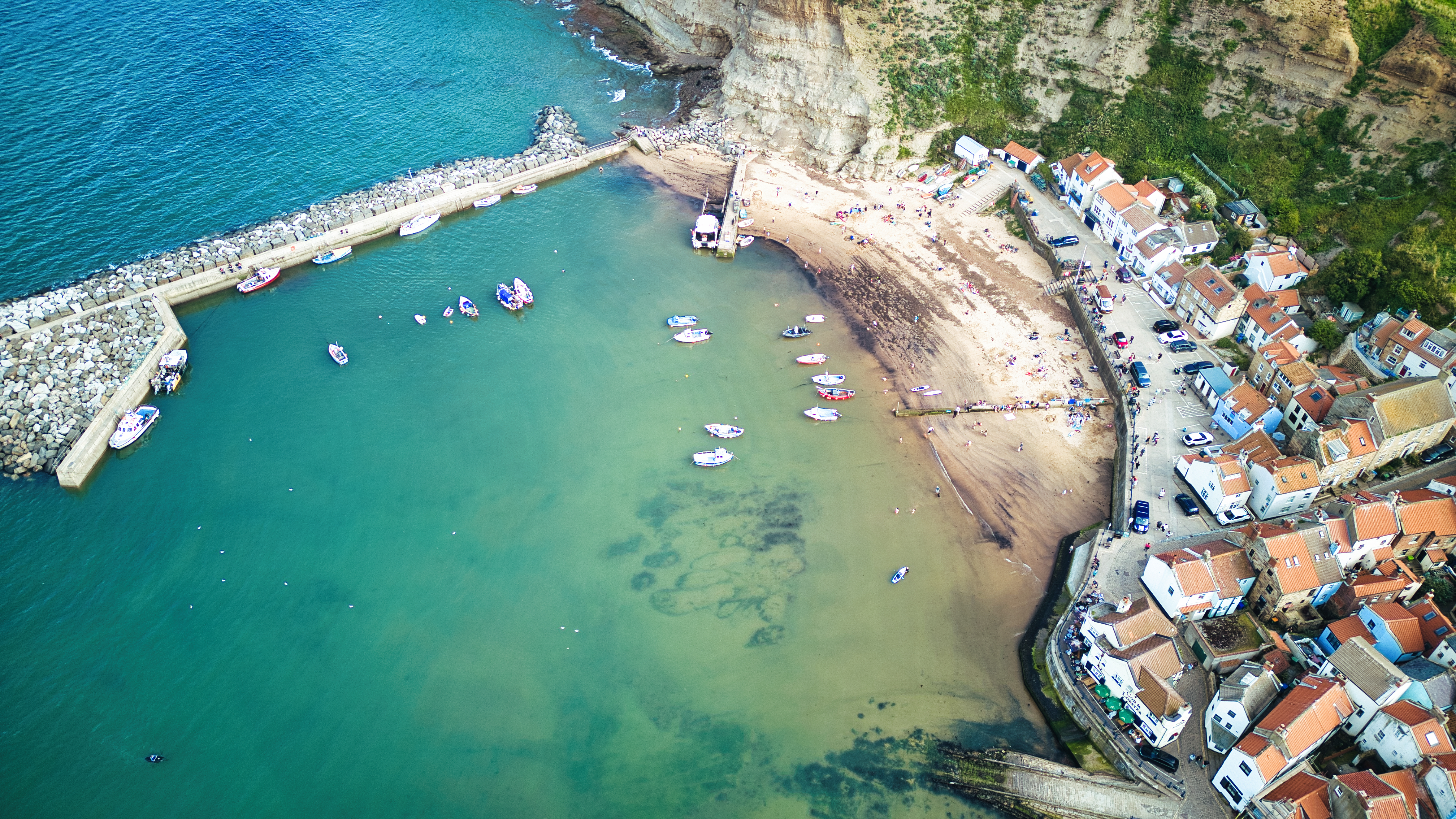 Aerial view of a quaint coastal village with houses along a winding river, near cliffs and green fields in Staithes, England.