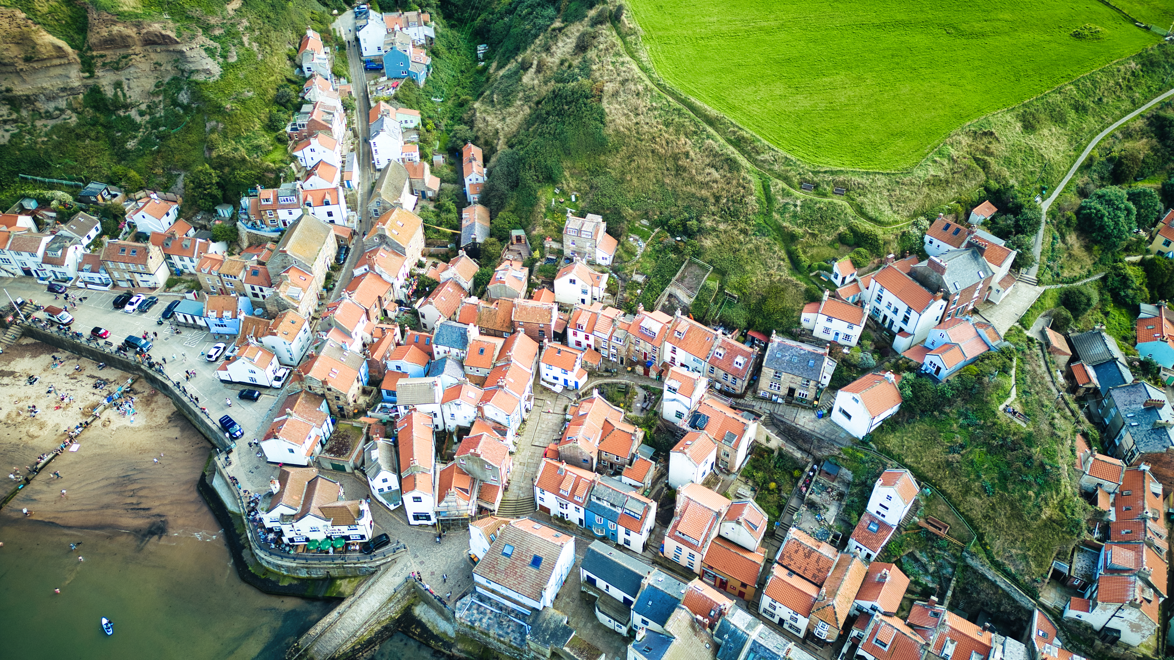Aerial view of a quaint coastal village with houses along a winding river, near cliffs and green fields in Staithes, England.