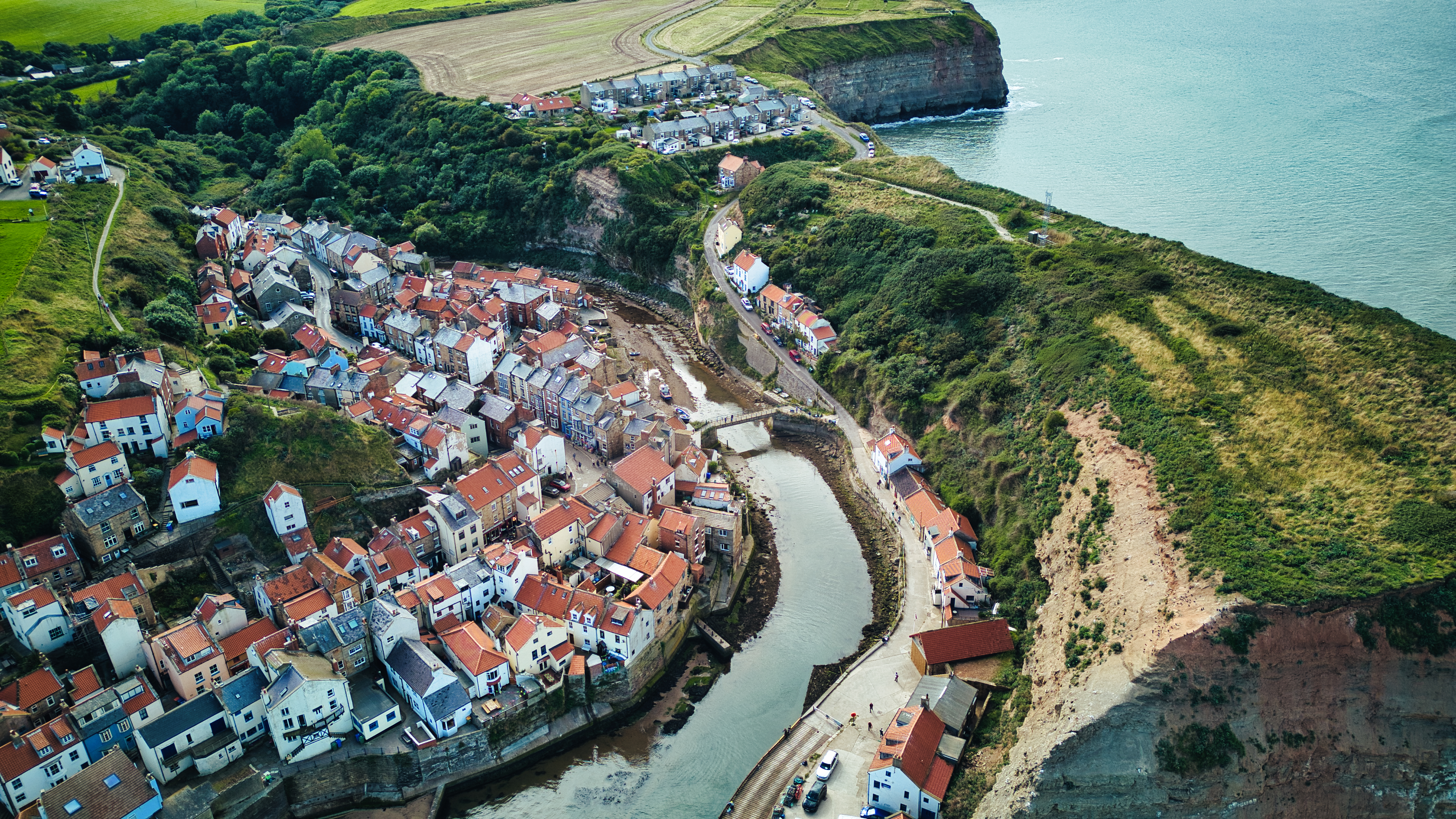 Aerial view of a quaint coastal village with houses nestled by a river leading to the sea, surrounded by green cliffs in Staithes, England.