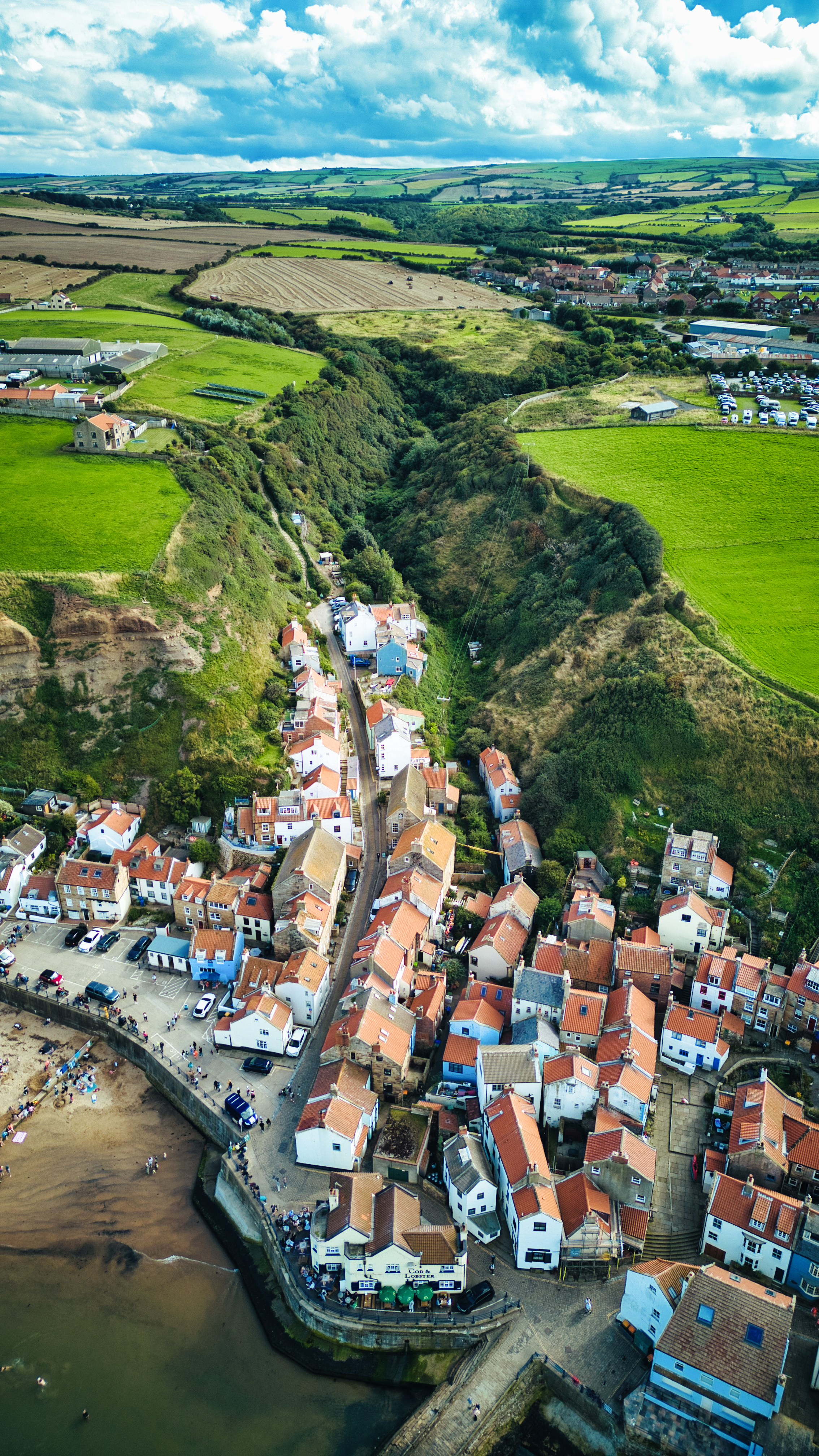 Aerial view of a quaint coastal village with red-roofed houses and a meandering river leading to the sea in Staithes, England.