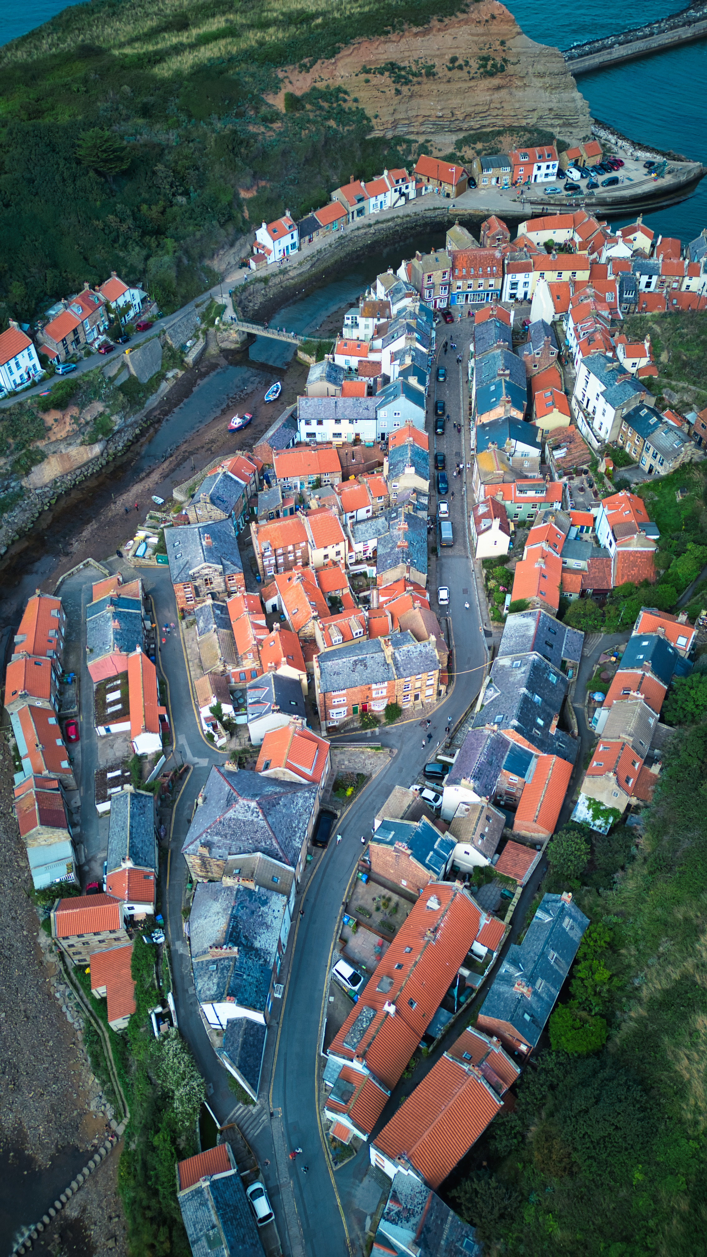 Aerial view of a quaint coastal village with red-roofed houses and winding streets in Staithes, England.