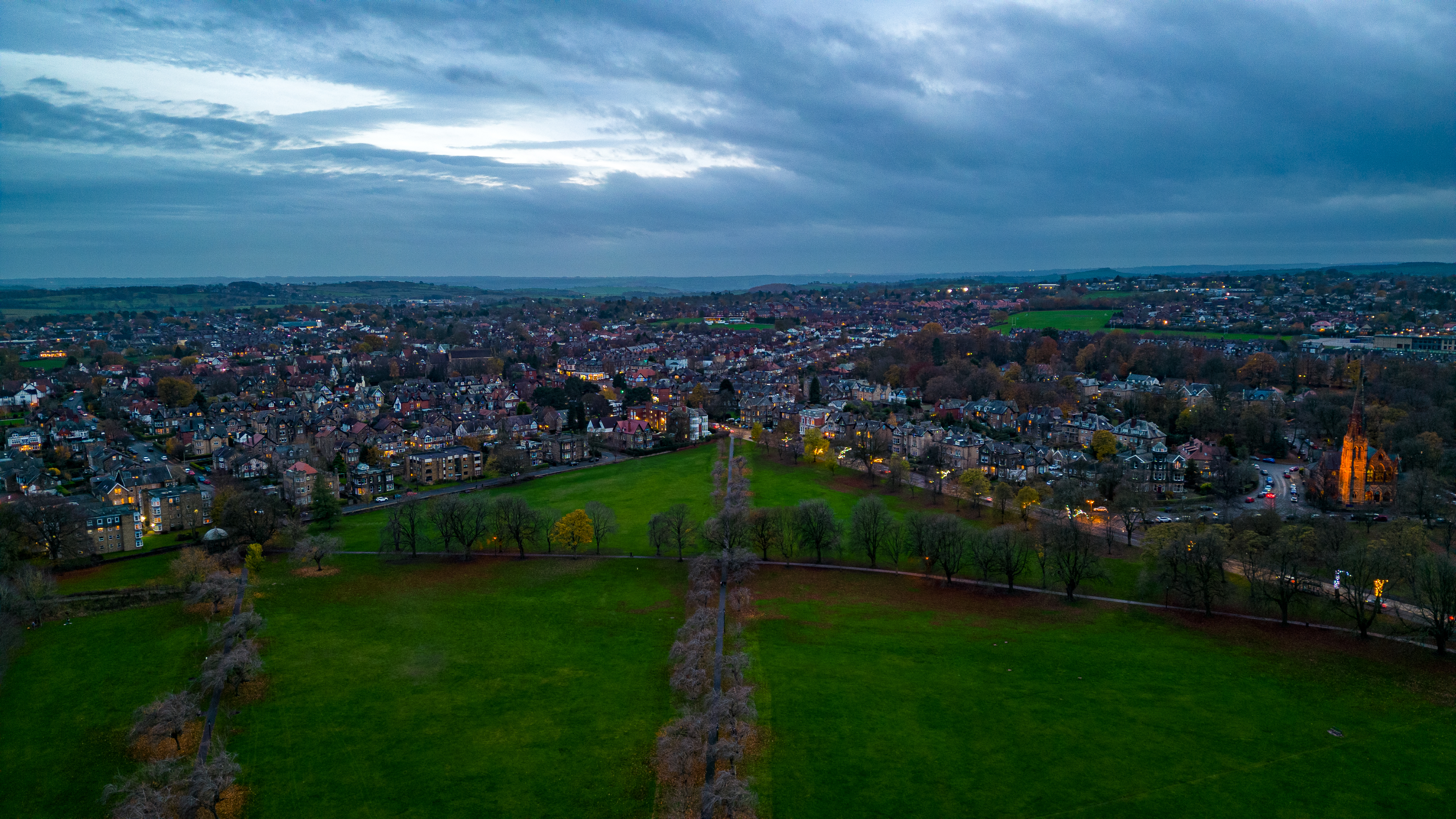 Aerial view of a quaint town at dusk with lush greenery and dramatic cloudy skies in Harrogate, North Yorkshire.