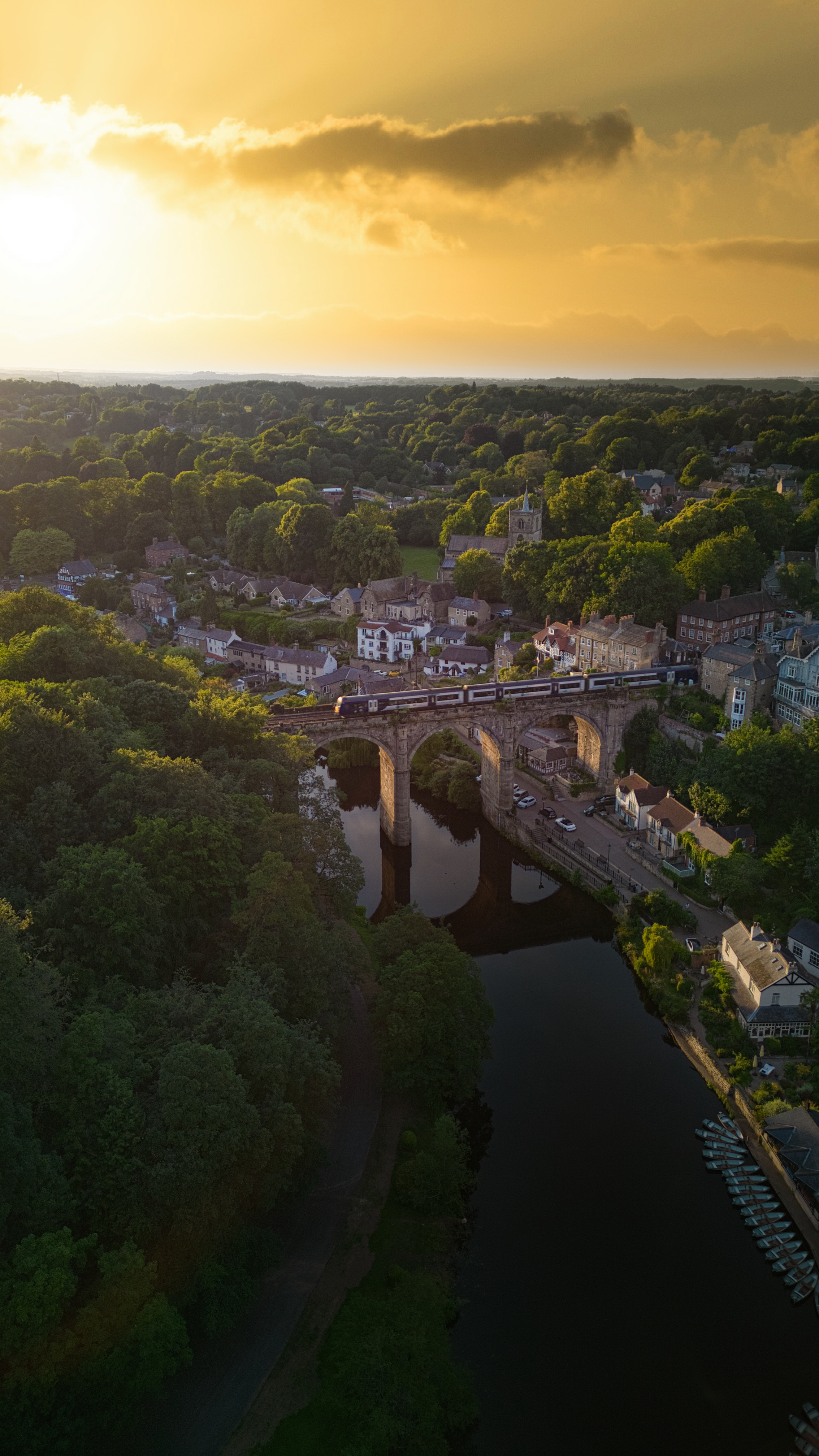 Aerial view of a quaint town at sunset with warm light bathing the landscape and buildings, showcasing the serene beauty of the countryside Aerial view of a historic town with an ancient tower, surrounded by lush green trees under a clear blue sky in Knaresborough, North Yorkshire.
