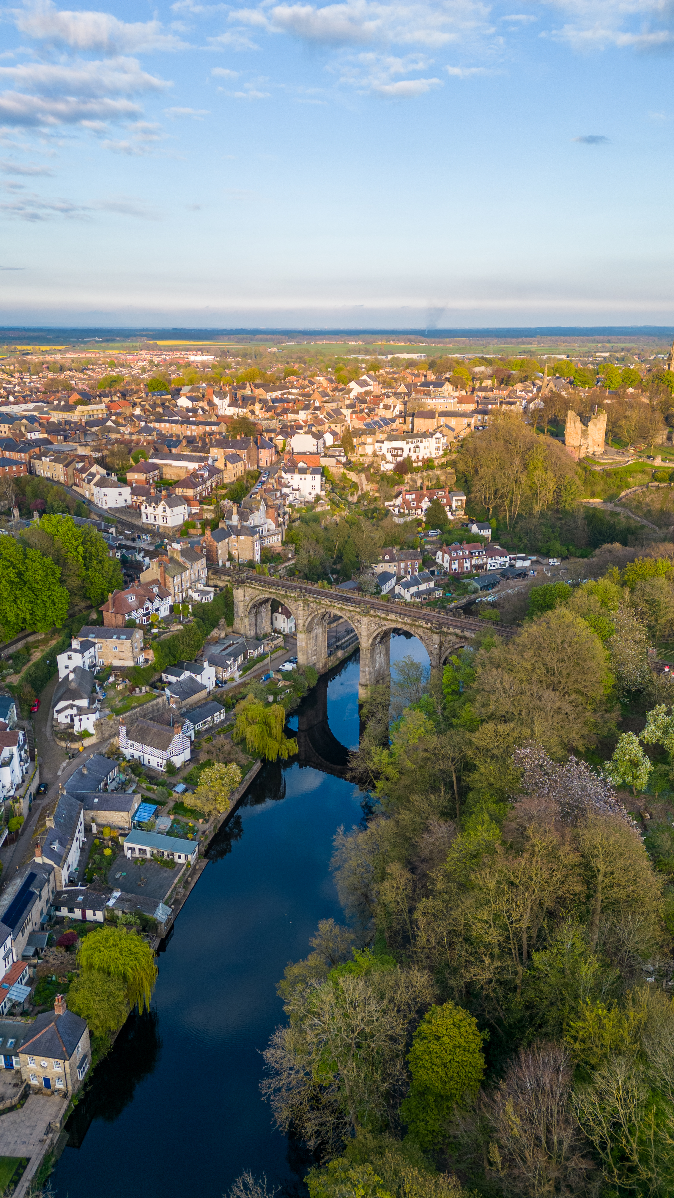 Aerial view of a quaint town with historic bridge over a river, surrounded by lush greenery and residential areas under a clear blue sky in Knaresborough, North Yorkshire.