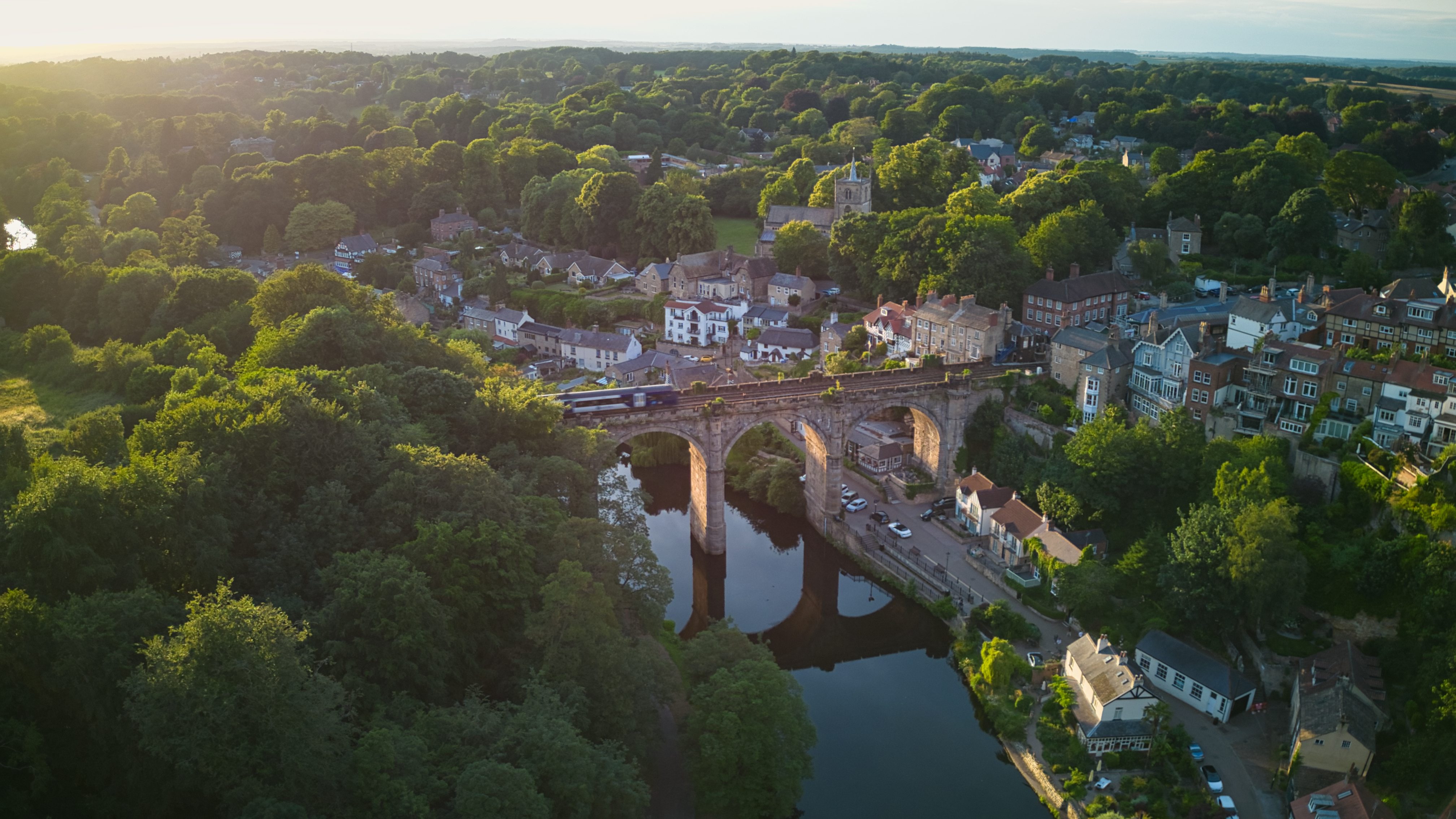 Aerial view of a quaint town with historic bridge over a river, surrounded by lush greenery at sunset Aerial view of a historic town with an ancient tower, surrounded by lush green trees under a clear blue sky in Knaresborough, North Yorkshire.