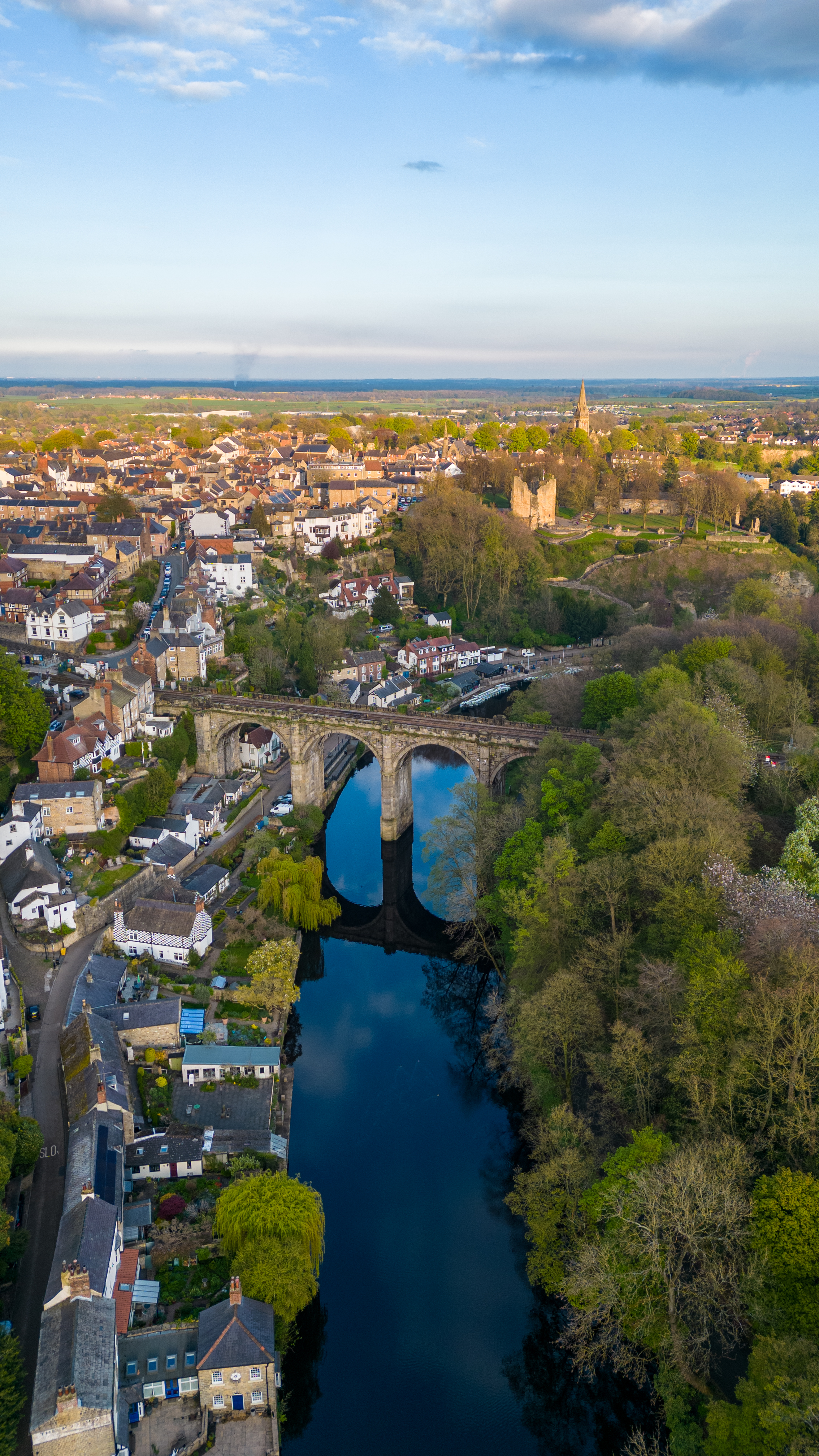 Aerial view of a quaint town with historic buildings and a bridge over a river, surrounded by lush greenery and a clear blue sky in Knaresborough, North Yorkshire.
