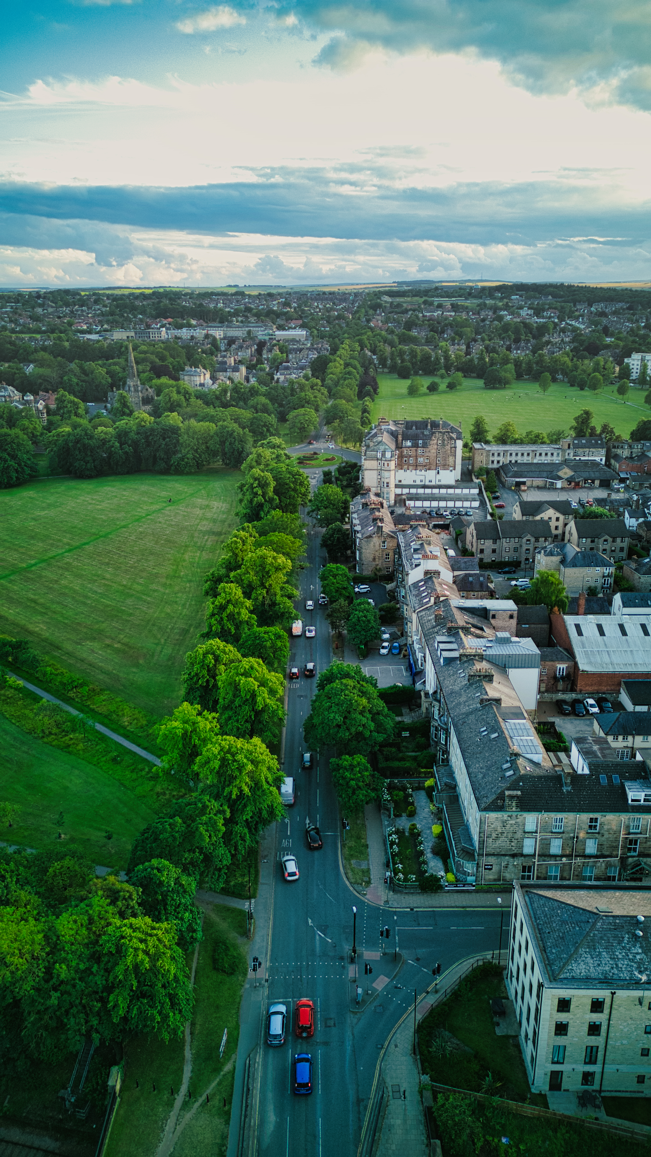 Aerial view of a quaint town with historic buildings and a lush green park, under a dramatic sky in Harrogate, North Yorkshire.