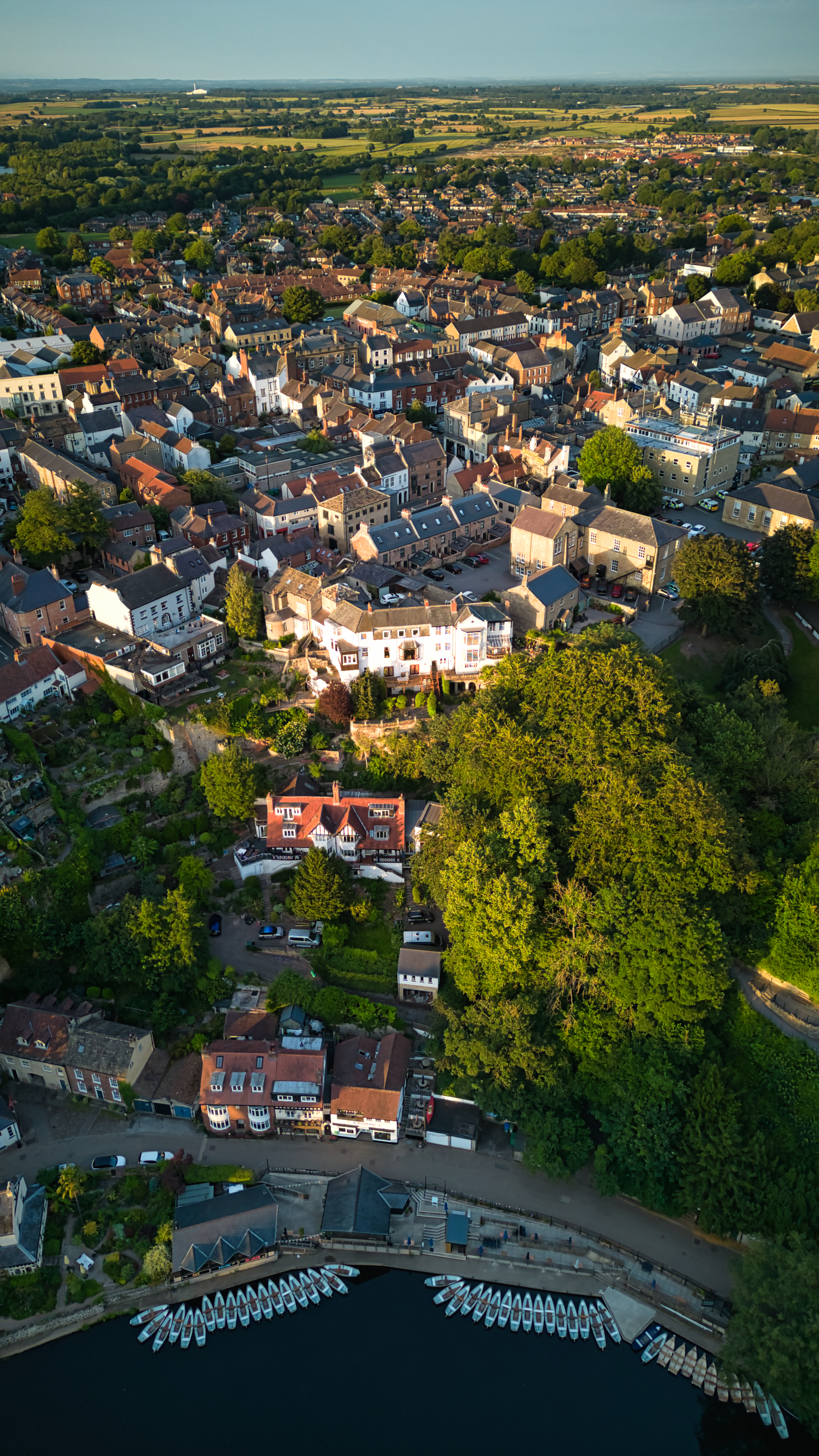 Aerial view of a quaint town with historic buildings near a marina with boats, captured during golden hour in Knaresborough, North Yorkshire.