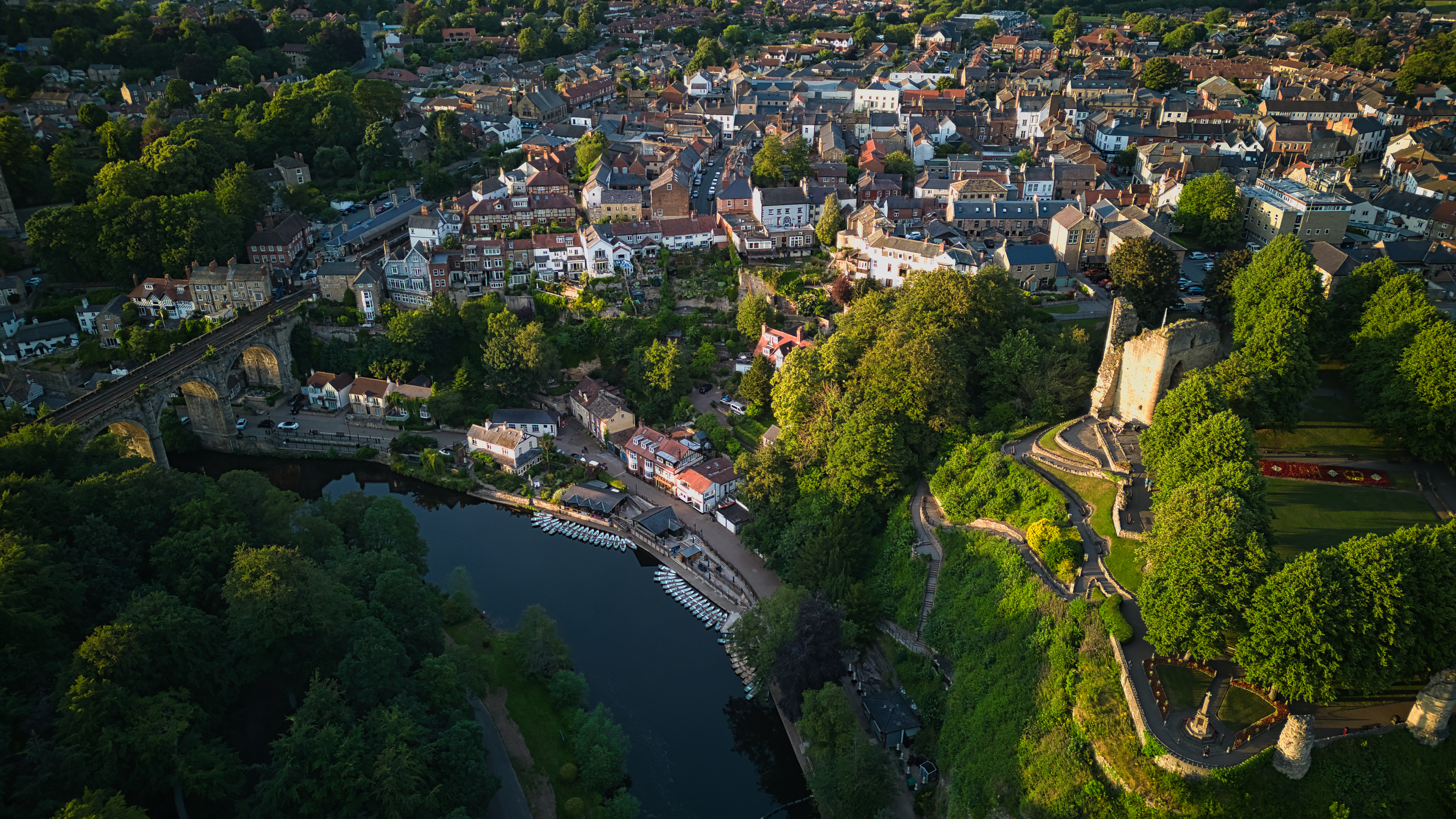 Aerial view of a quaint town with historic buildings near a river at sunset in Knaresborough, North Yorkshire.
