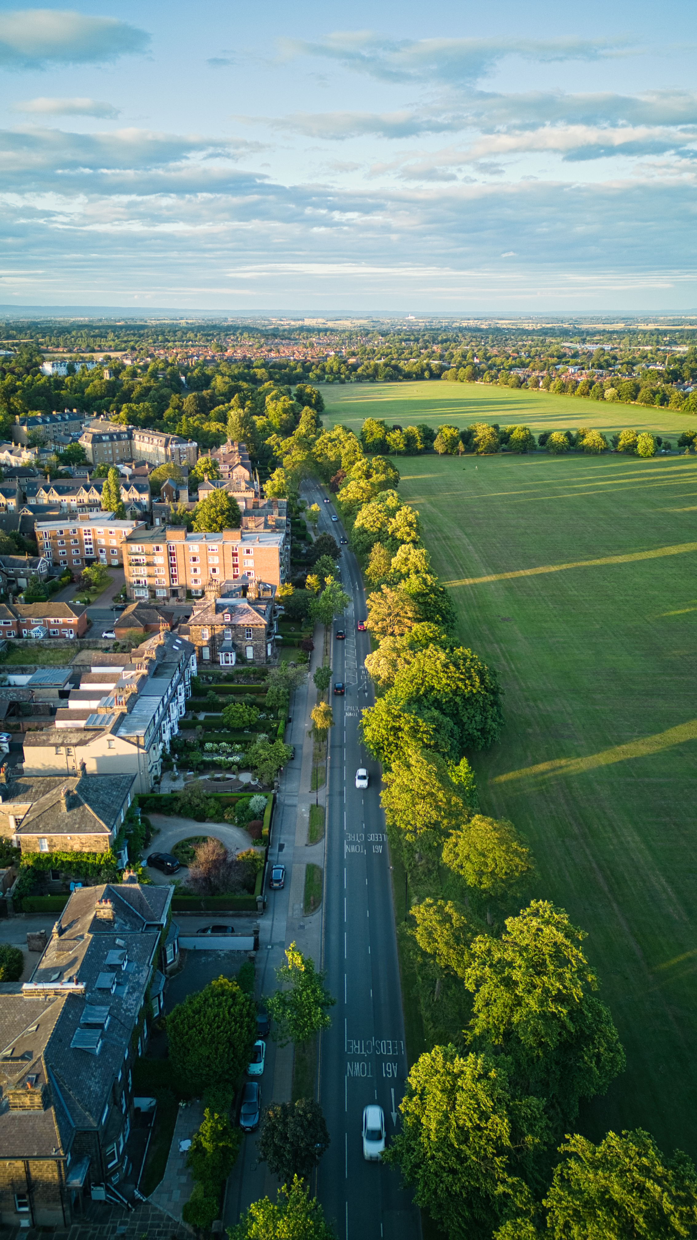 Aerial view of a quaint town with lush green fields under a clear blue sky at sunset in Harrogate, North Yorkshire.