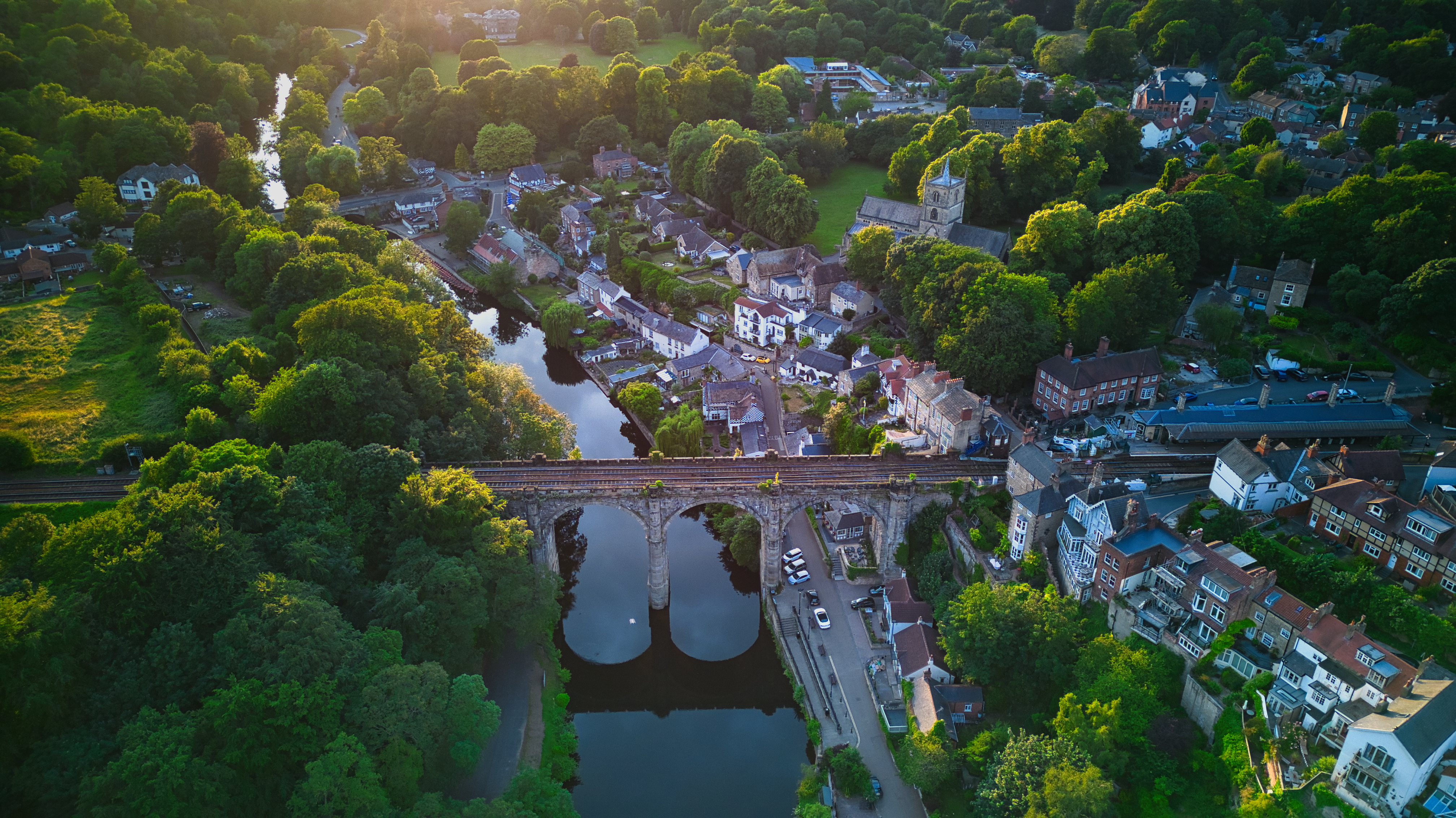 Aerial view of a quaint town with lush greenery, a river, and a bridge at sunset in Knaresborough, North Yorkshire.