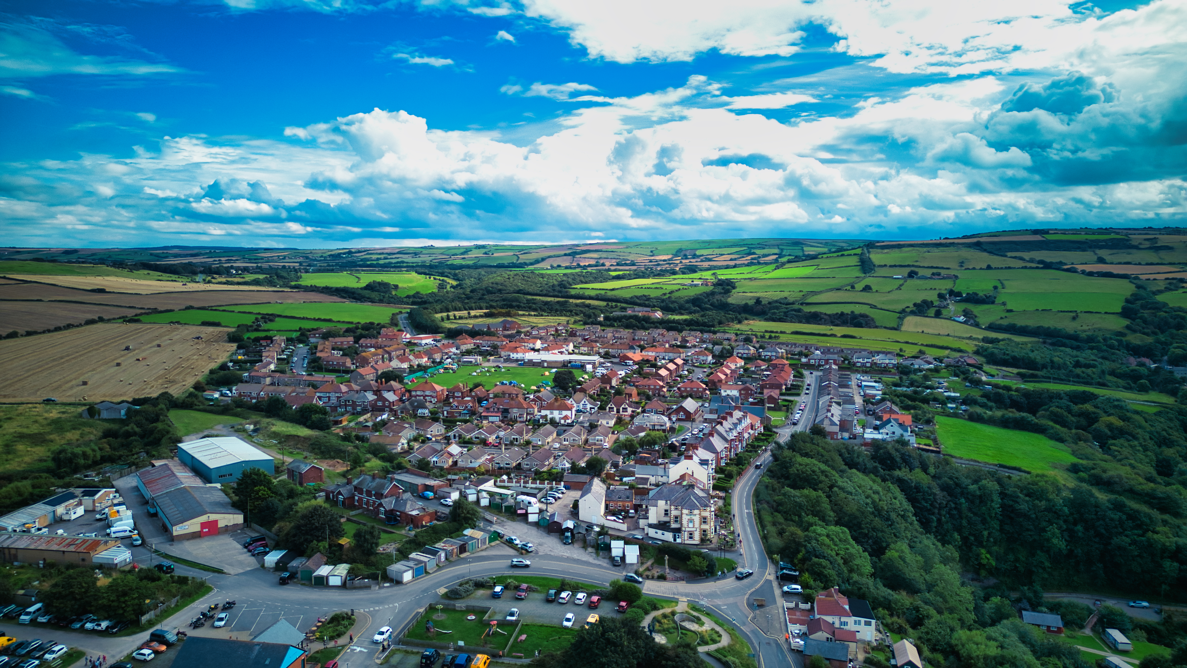 Aerial view of a quaint town with lush greenery and farmland under a partly cloudy sky in Staithes, England.