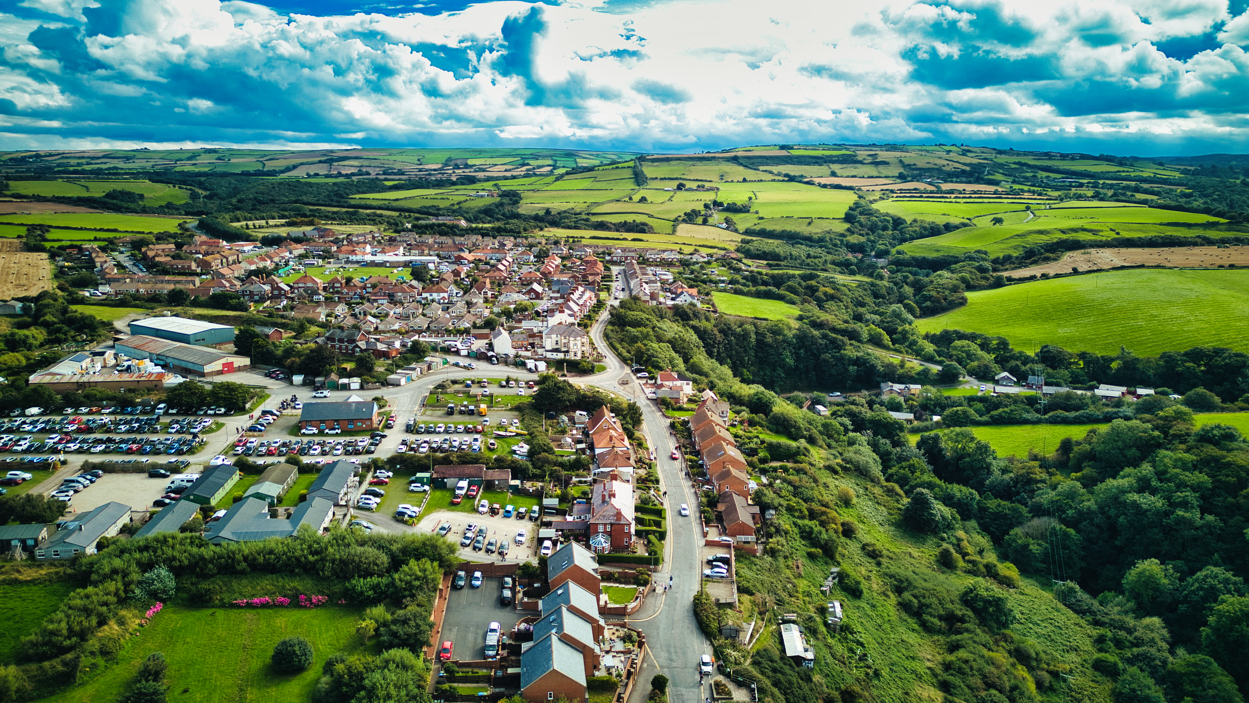 Aerial view of a quaint town with lush greenery under a partly cloudy sky in Staithes, England.
