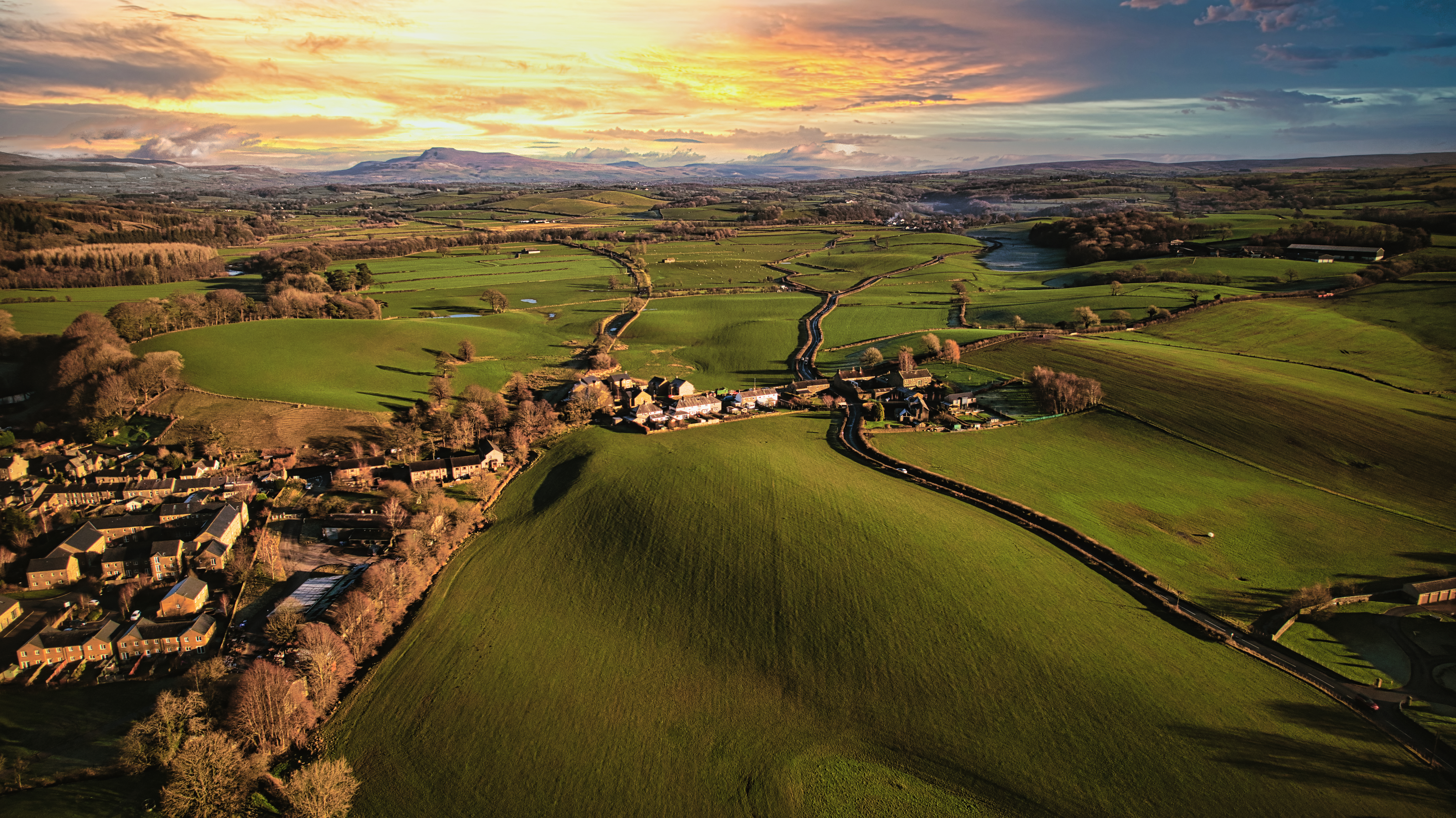 Aerial view of a quaint village amidst lush green fields with rolling hills in the background during sunset.