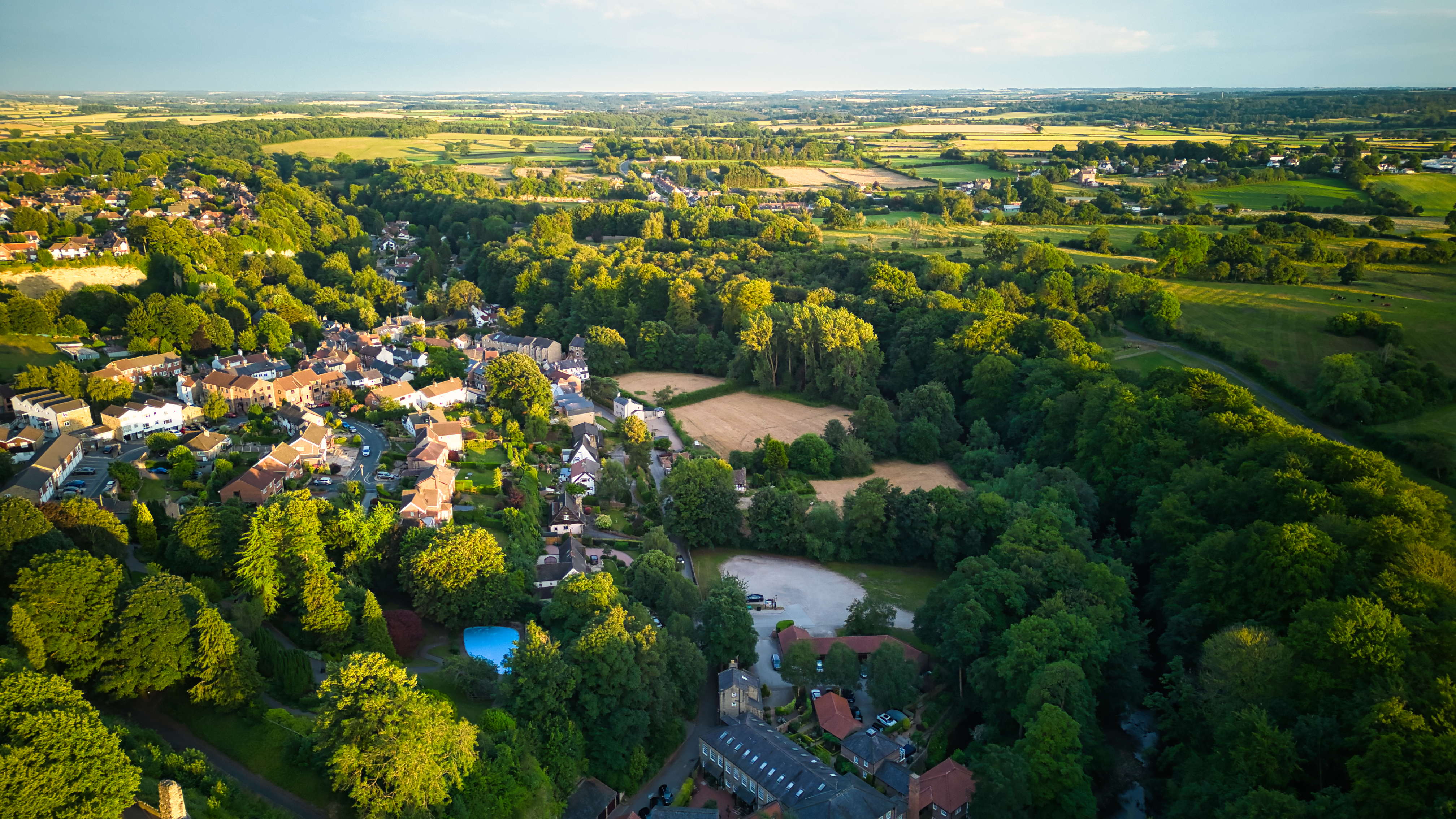 Aerial view of a quaint village surrounded by lush green fields and trees under a clear sky at golden hour in Knaresborough, North Yorkshire.