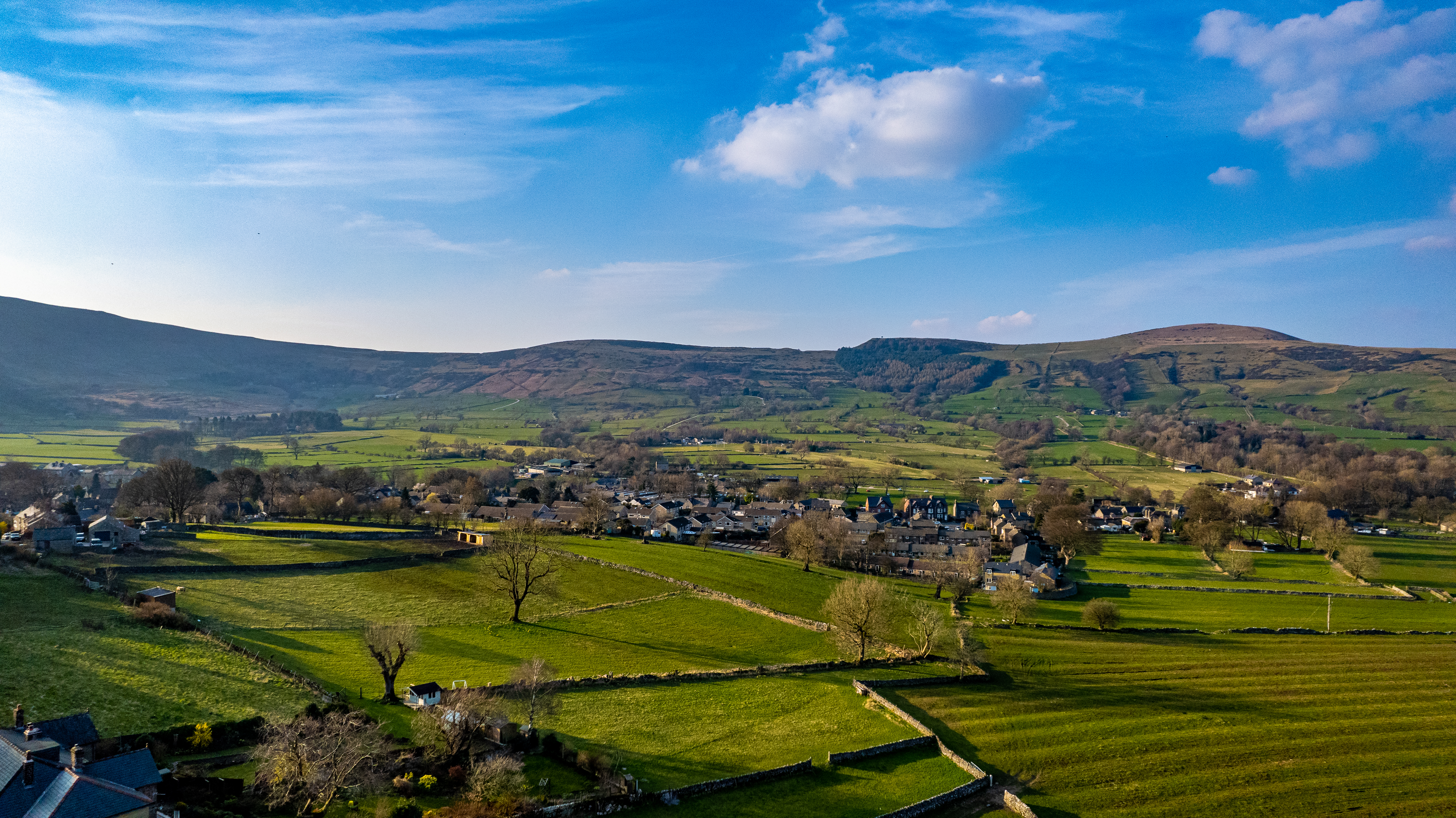Aerial view of a quaint village with green fields and rolling hills under a blue sky with scattered clouds in Peak District, England.