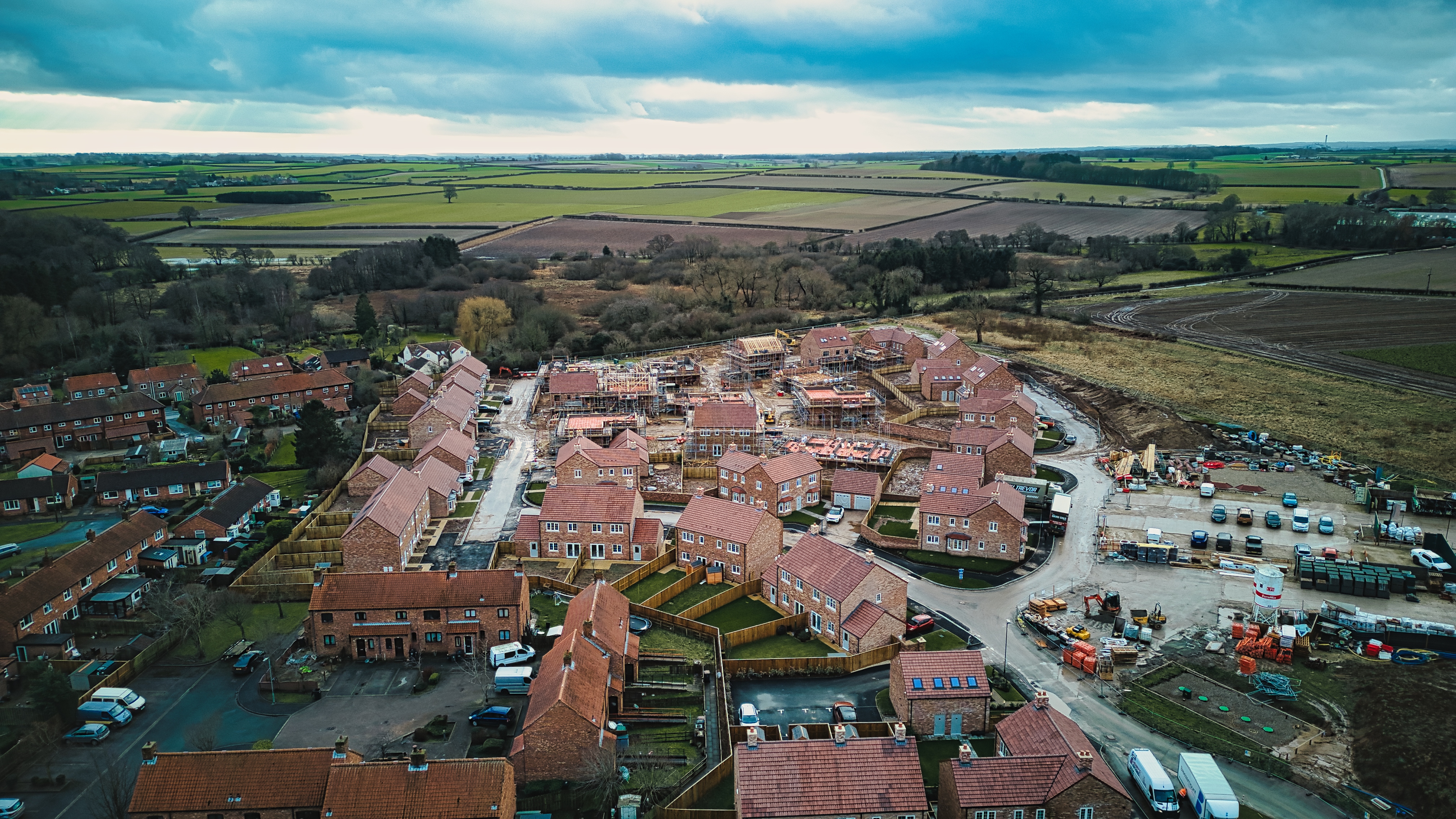 Aerial view of a quaint village with red-roofed houses and surrounding farmland under a cloudy sky.