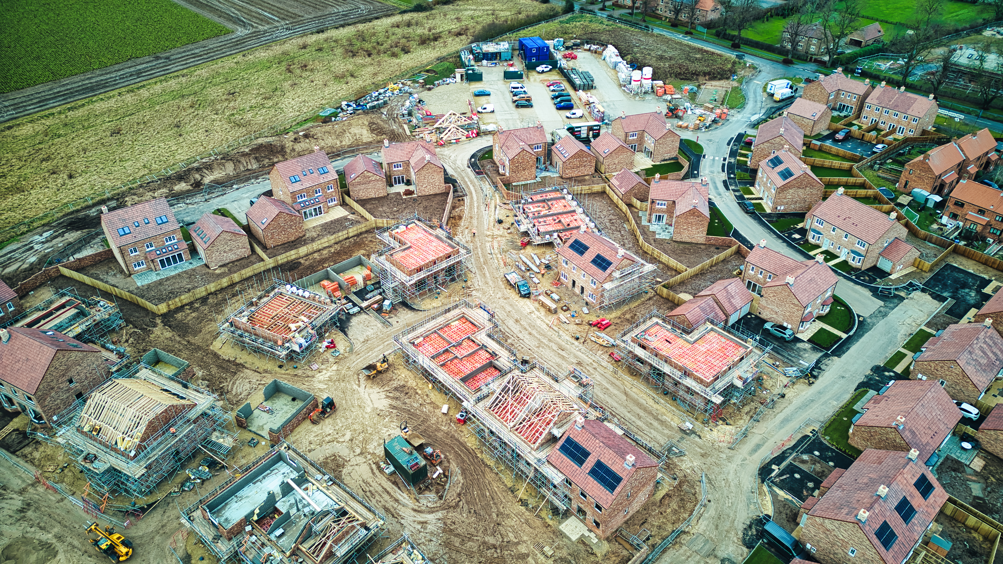 Aerial view of a residential construction site with partially built houses and construction vehicles.