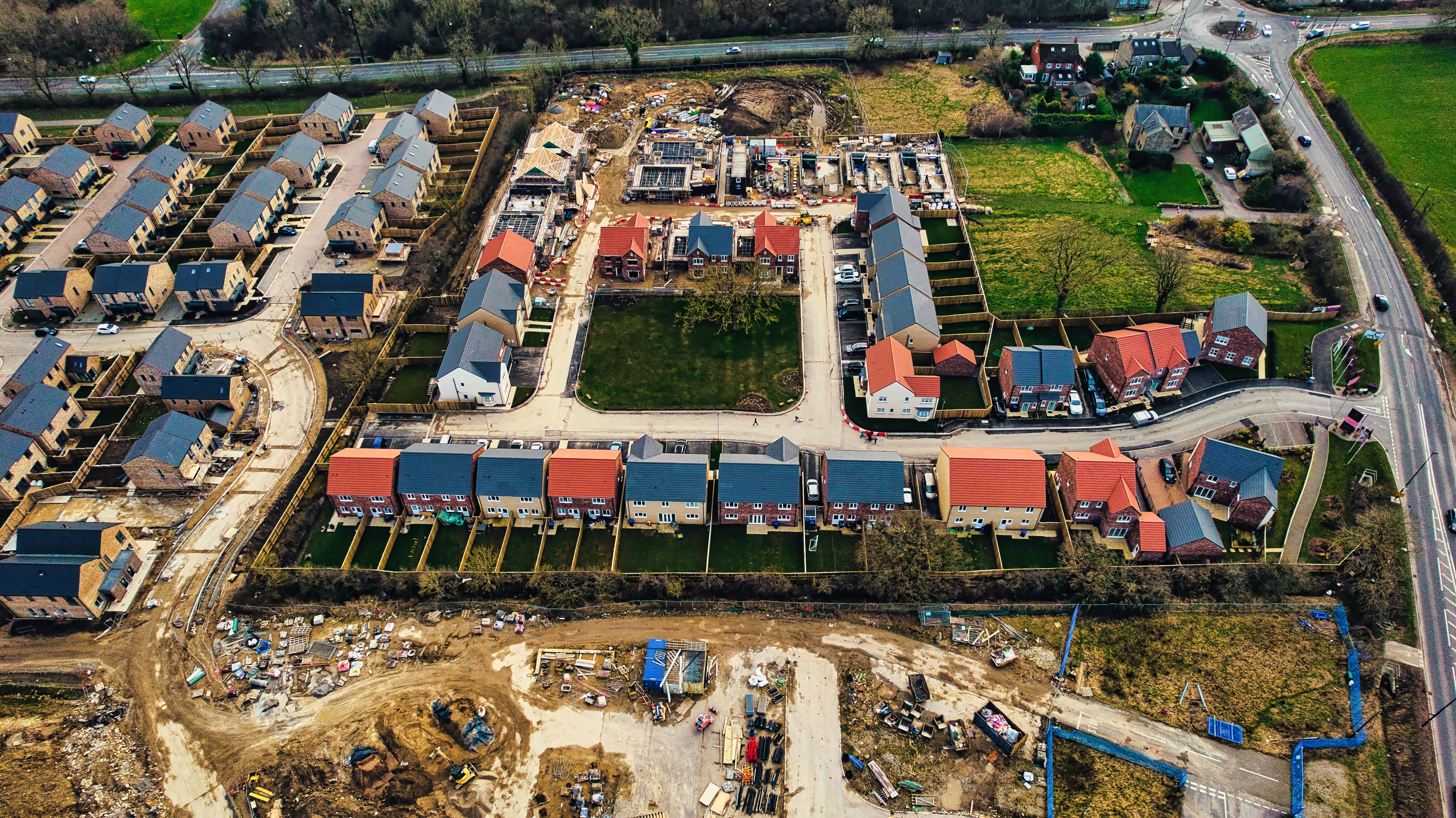 Aerial view of a residential construction site with partially completed houses and infrastructure development in Harrogate, North Yorkshire.
