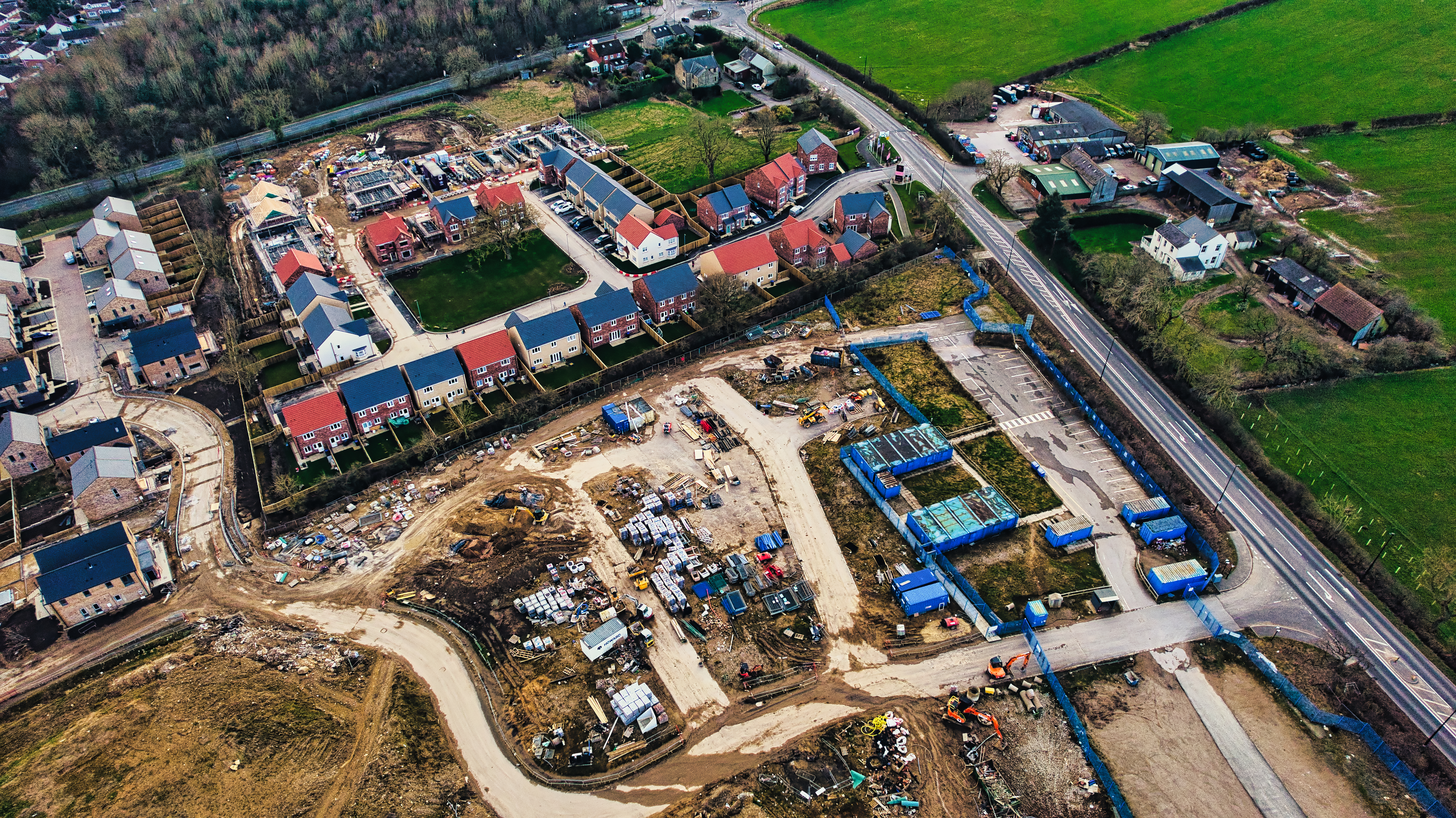 Aerial view of a residential construction site with partially completed houses and infrastructure in Harrogate, North Yorkshire.