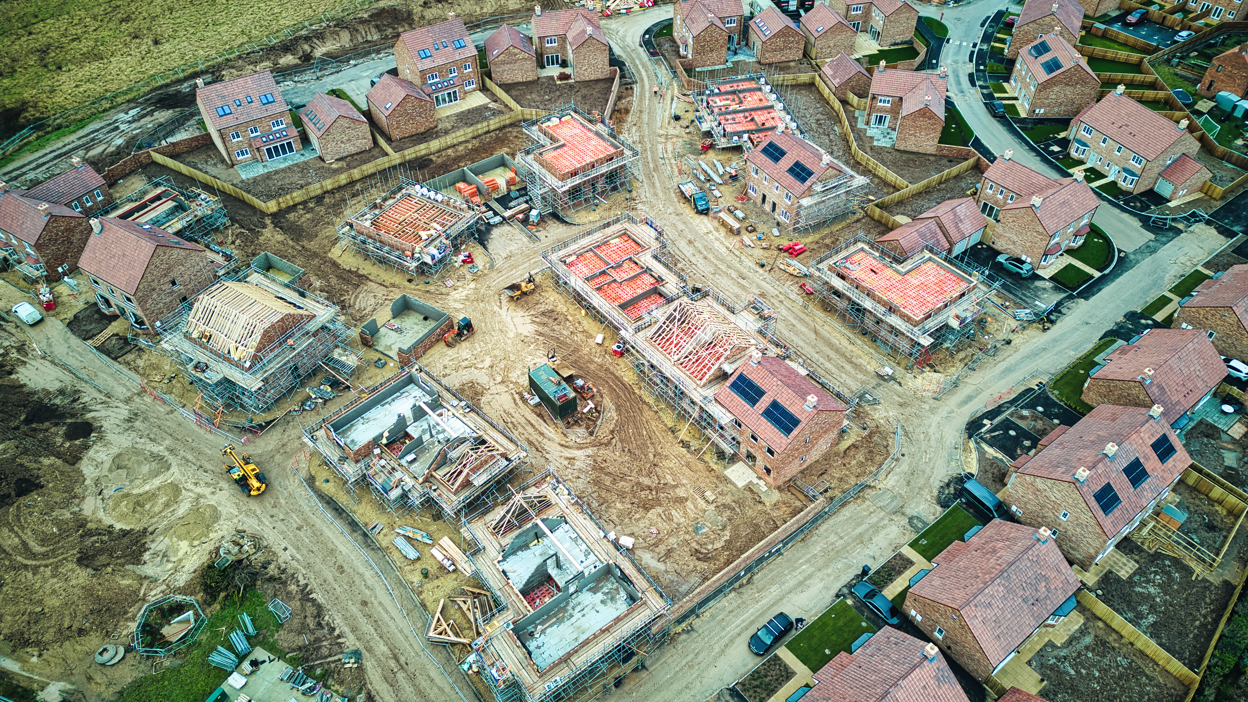 Aerial view of a residential construction site with partially completed houses and infrastructure.