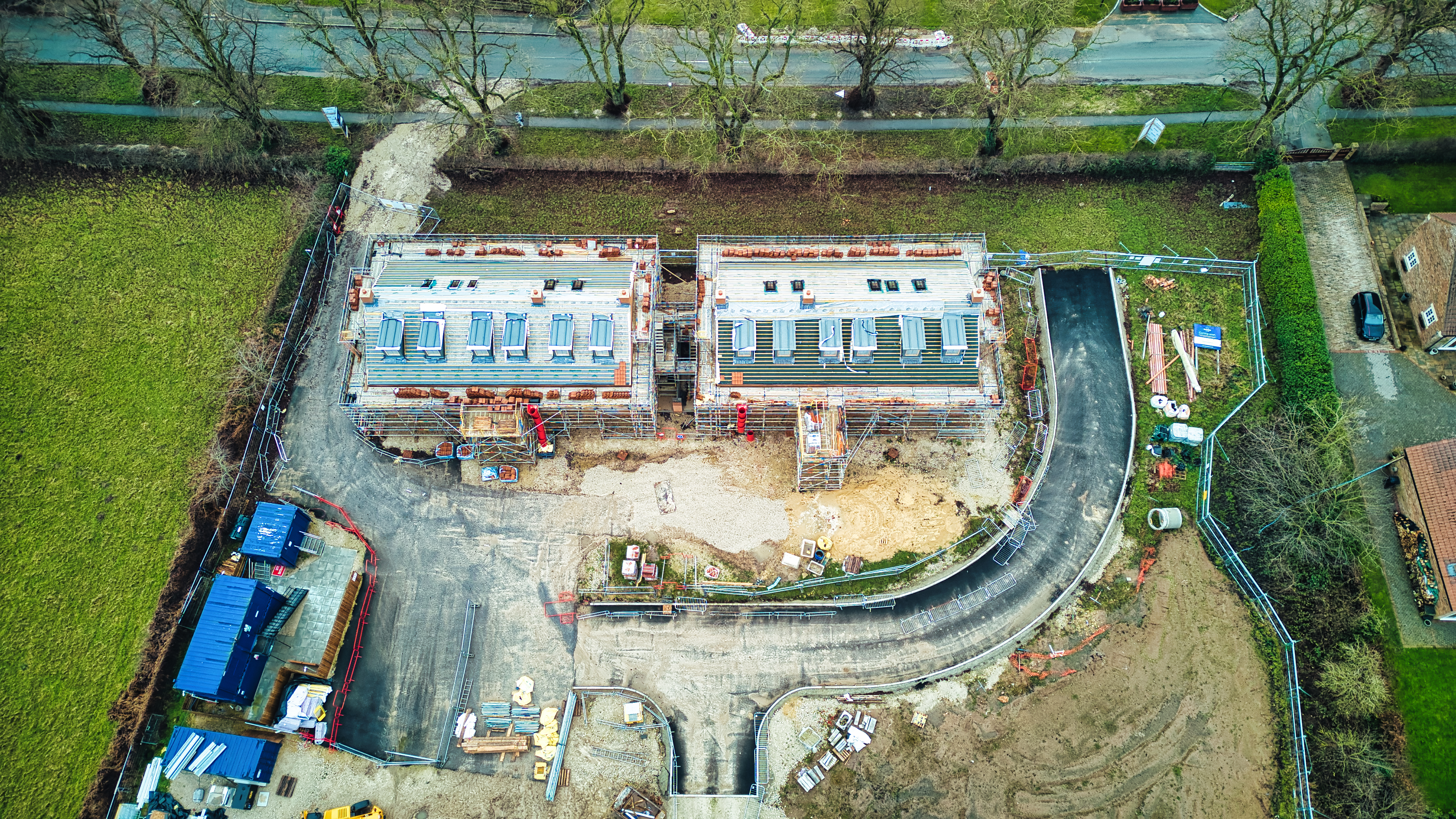 Aerial view of a residential construction site with unfinished houses and building materials.