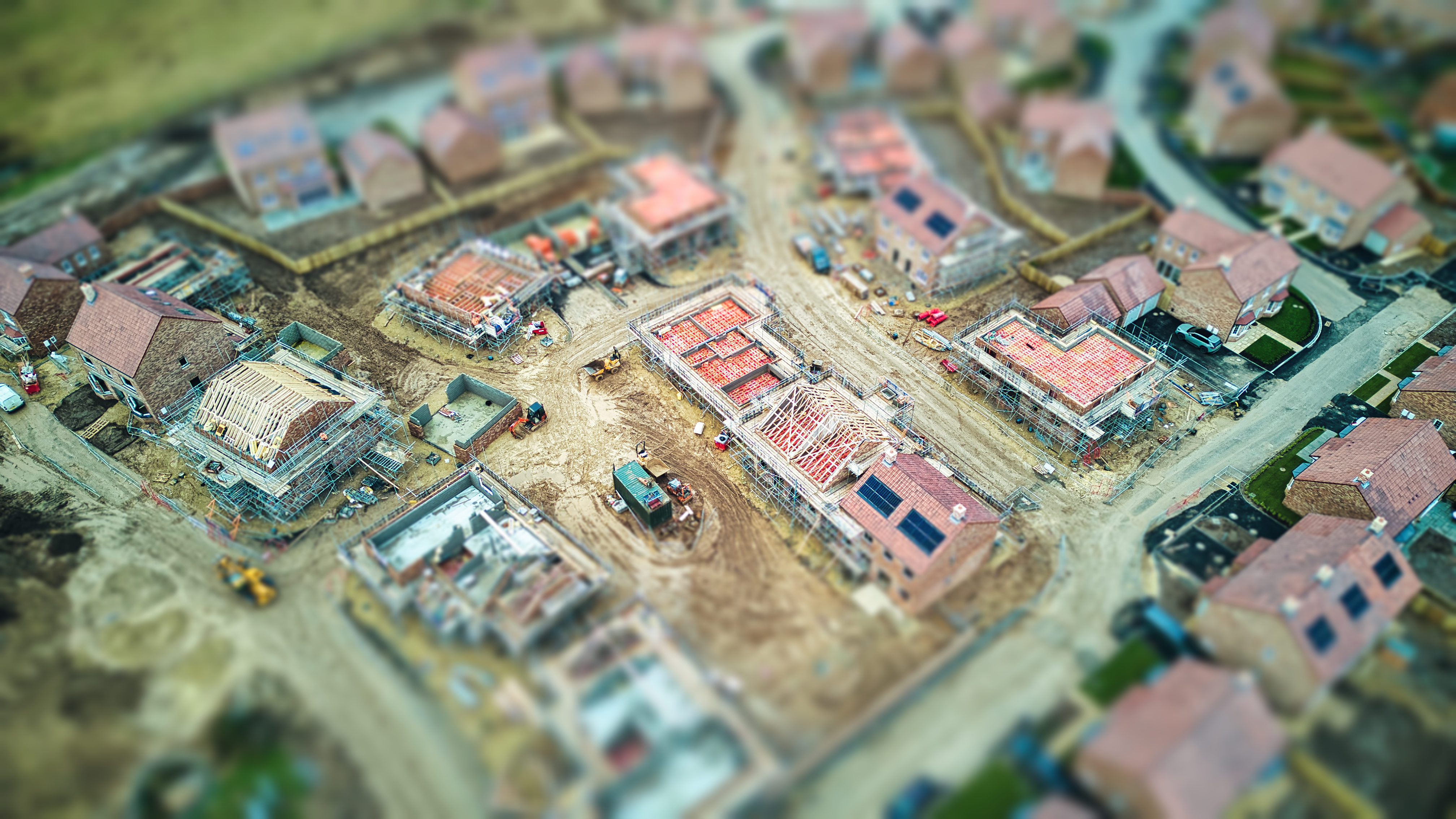 Aerial view of a residential construction site with unfinished houses and heavy machinery.