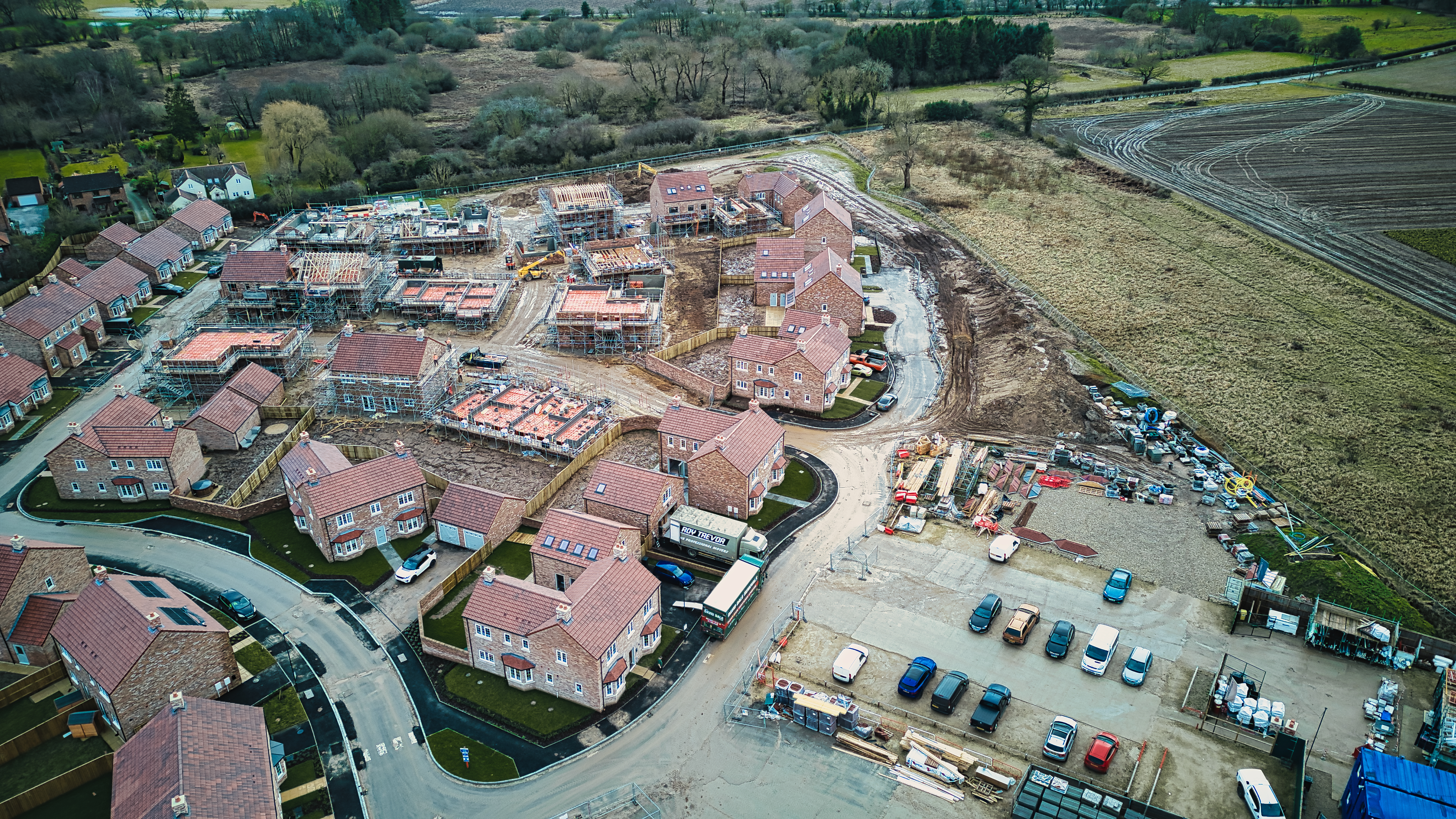 Aerial view of a residential development with houses and construction site, showcasing suburban expansion.